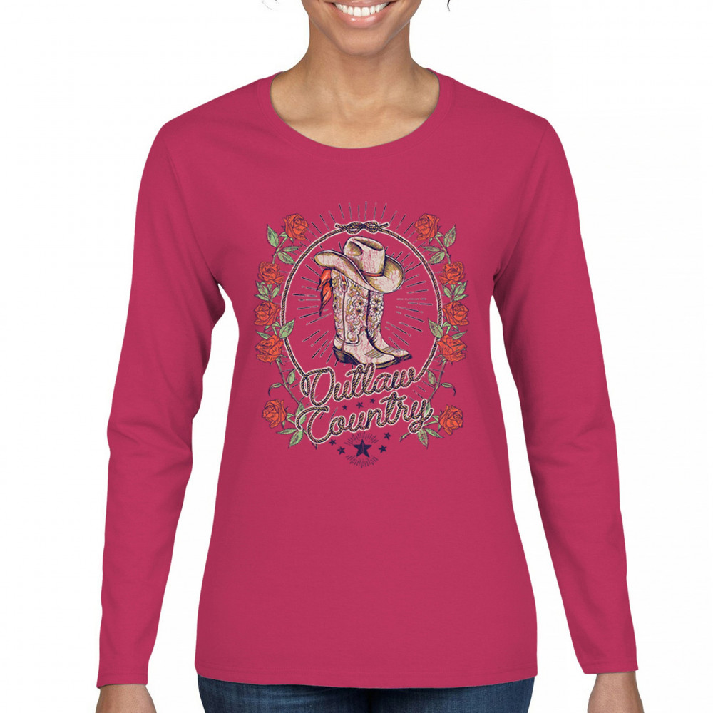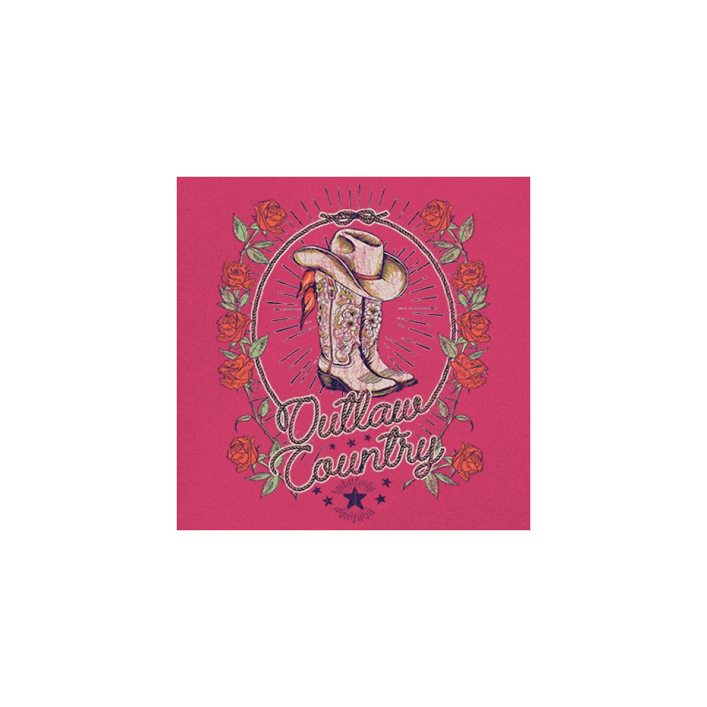Outlaw country design with cowgirl boots, hat, and roses. Bold feminine western style for concerts, rodeos, and southern lifestyle lovers.