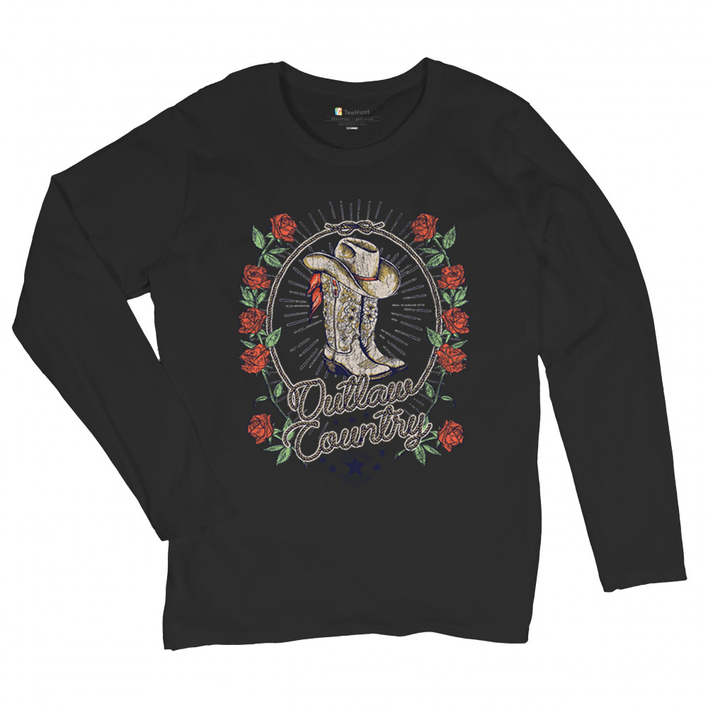 Outlaw country design with cowgirl boots, hat, and roses. Bold feminine western style for concerts, rodeos, and southern lifestyle lovers.