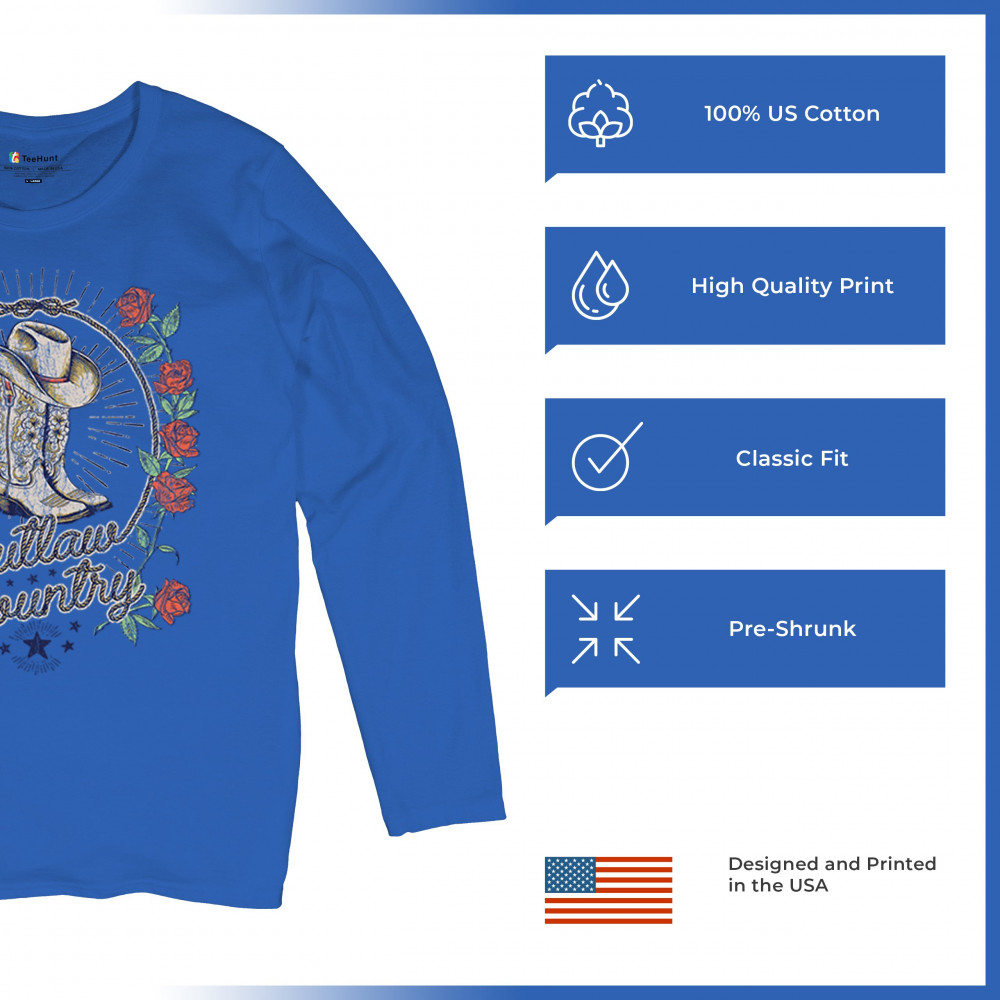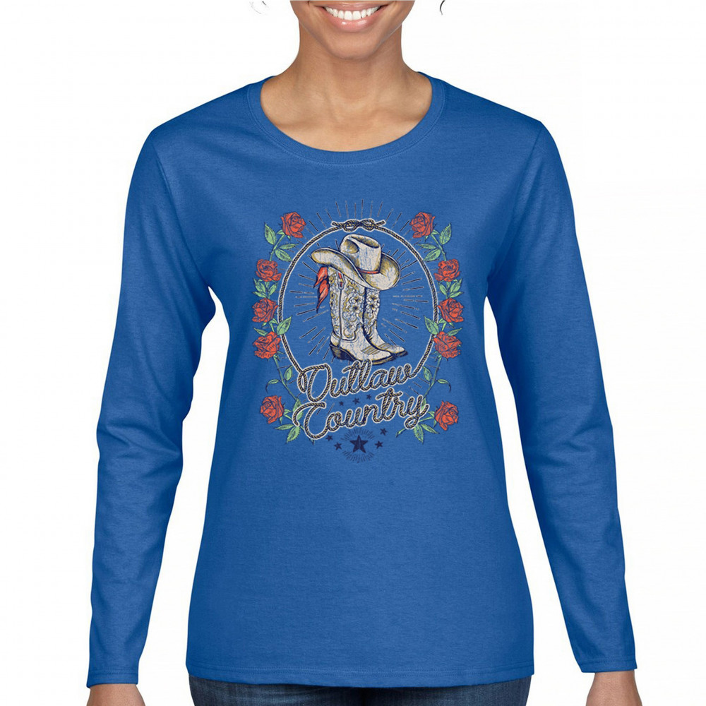 Outlaw country design with cowgirl boots, hat, and roses. Bold feminine western style for concerts, rodeos, and southern lifestyle lovers.