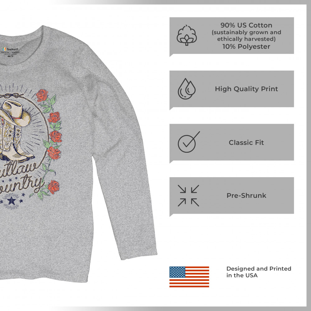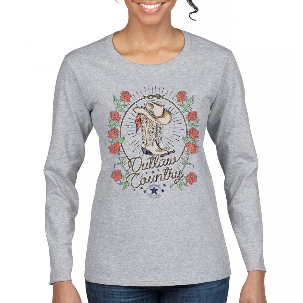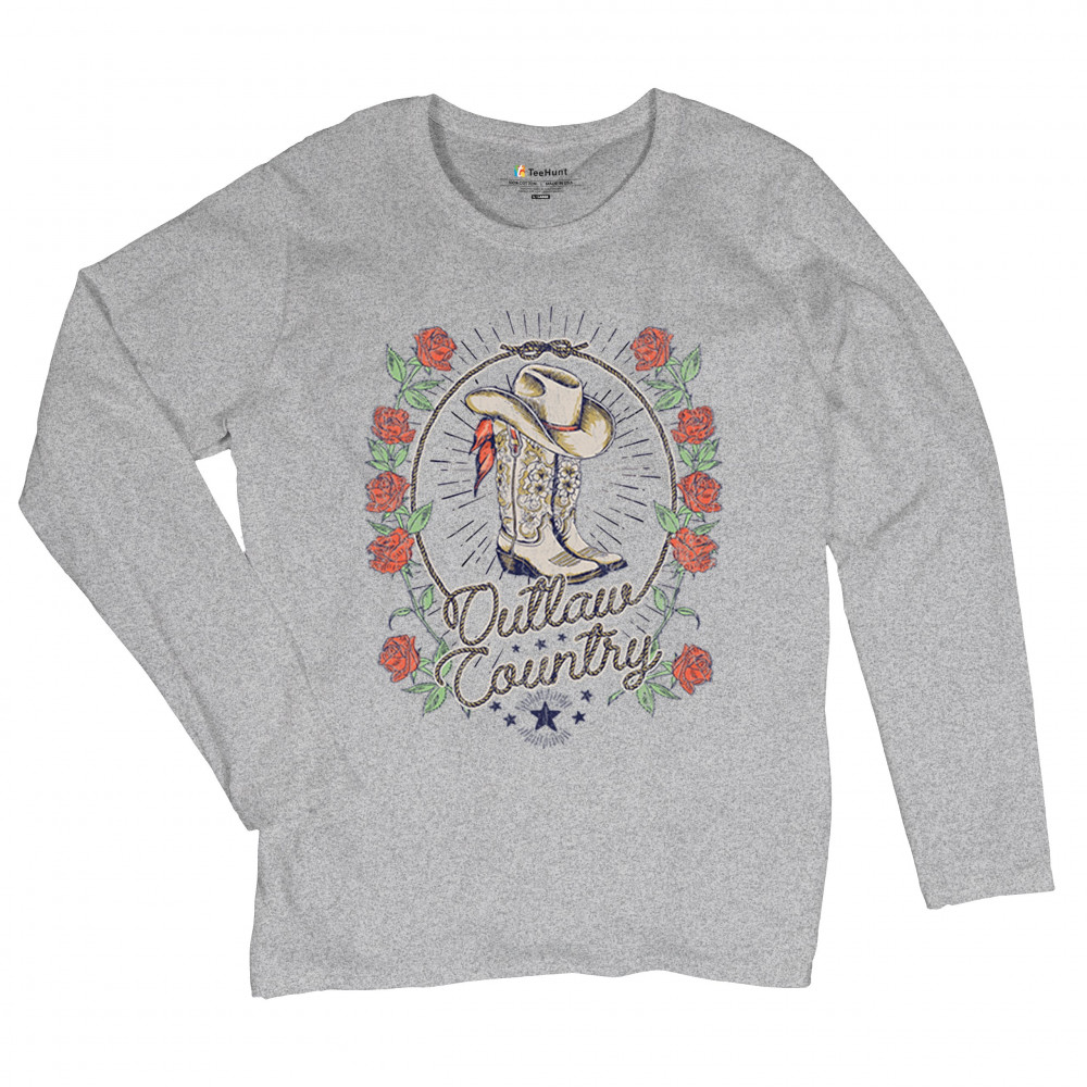 Outlaw country design with cowgirl boots, hat, and roses. Bold feminine western style for concerts, rodeos, and southern lifestyle lovers.