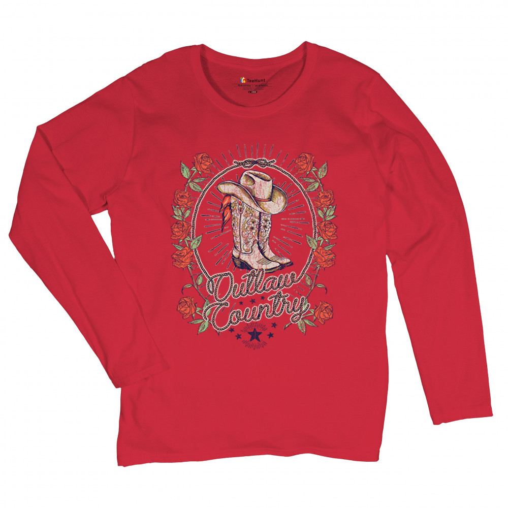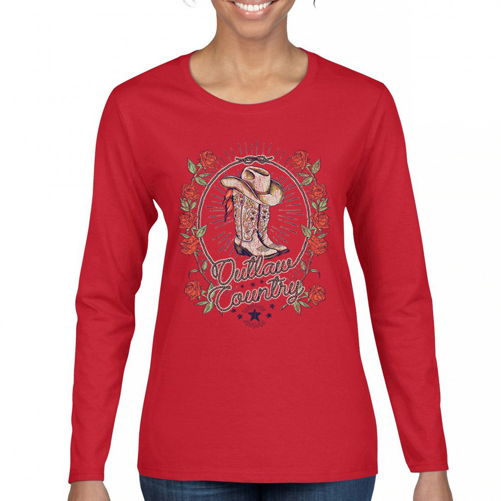 Outlaw country design with cowgirl boots, hat, and roses. Bold feminine western style for concerts, rodeos, and southern lifestyle lovers.