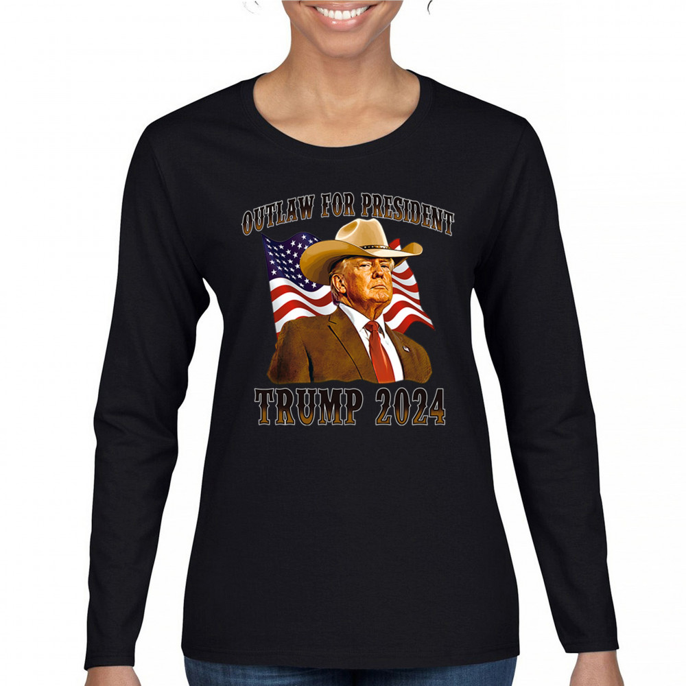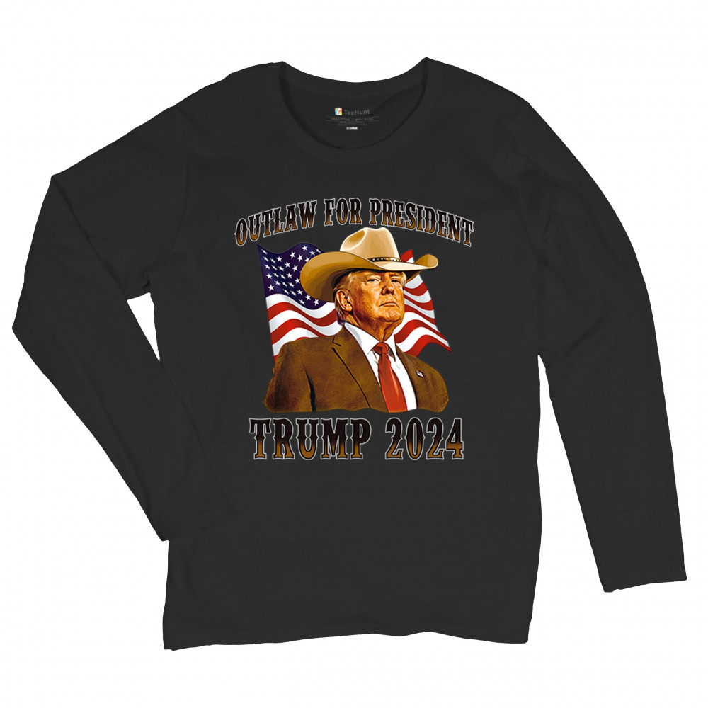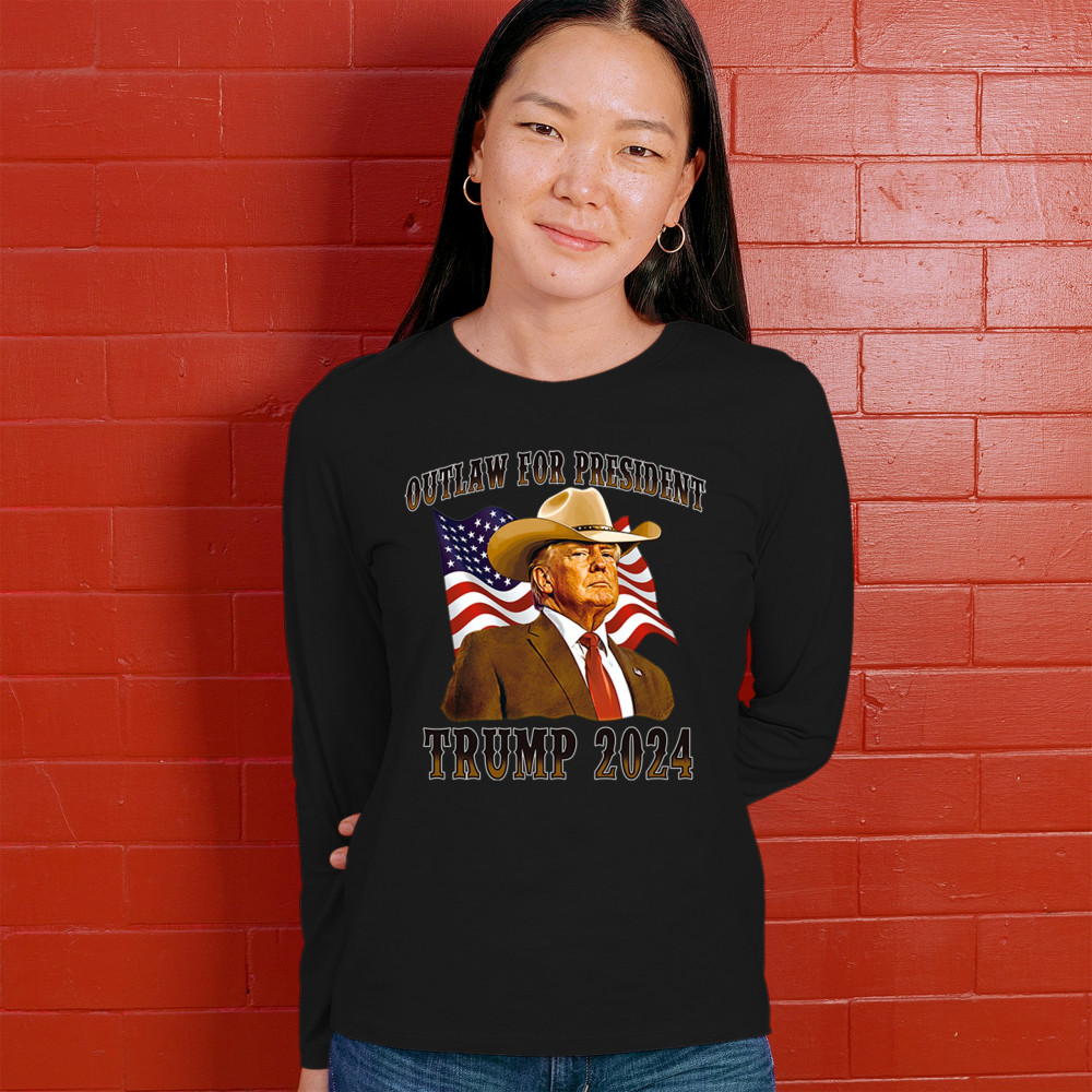 Bold "Outlaw for President" Trump 2024 design for conservative supporters, featuring Donald J. Trump and the American flag. Show your patriotism.