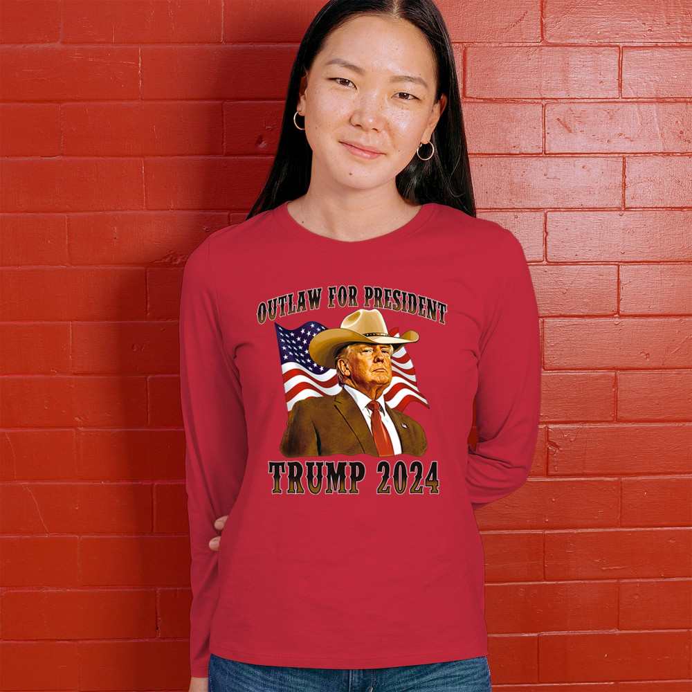 The "Outlaw for President" Trump 2024 design is a powerful symbol of American resilience and conservative pride. Featuring Donald J. Trump in a cowboy hat with the American flag waving behind, this design speaks to supporters who believe in the America First movement, conservative values, and a rebel spirit. Ideal for rallies, patriotic events, and anyone looking to make a bold statement for the 47th President of the United States.