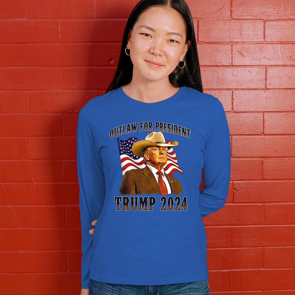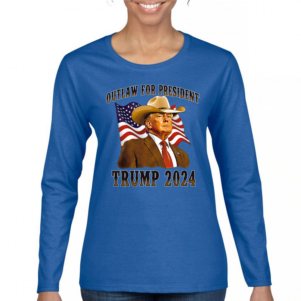 Bold "Outlaw for President" Trump 2024 design for conservative supporters, featuring Donald J. Trump and the American flag. Show your patriotism.