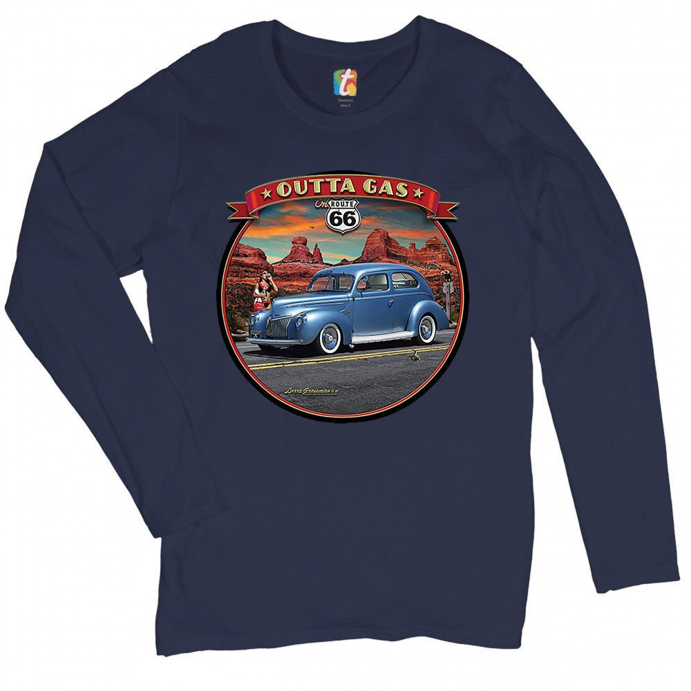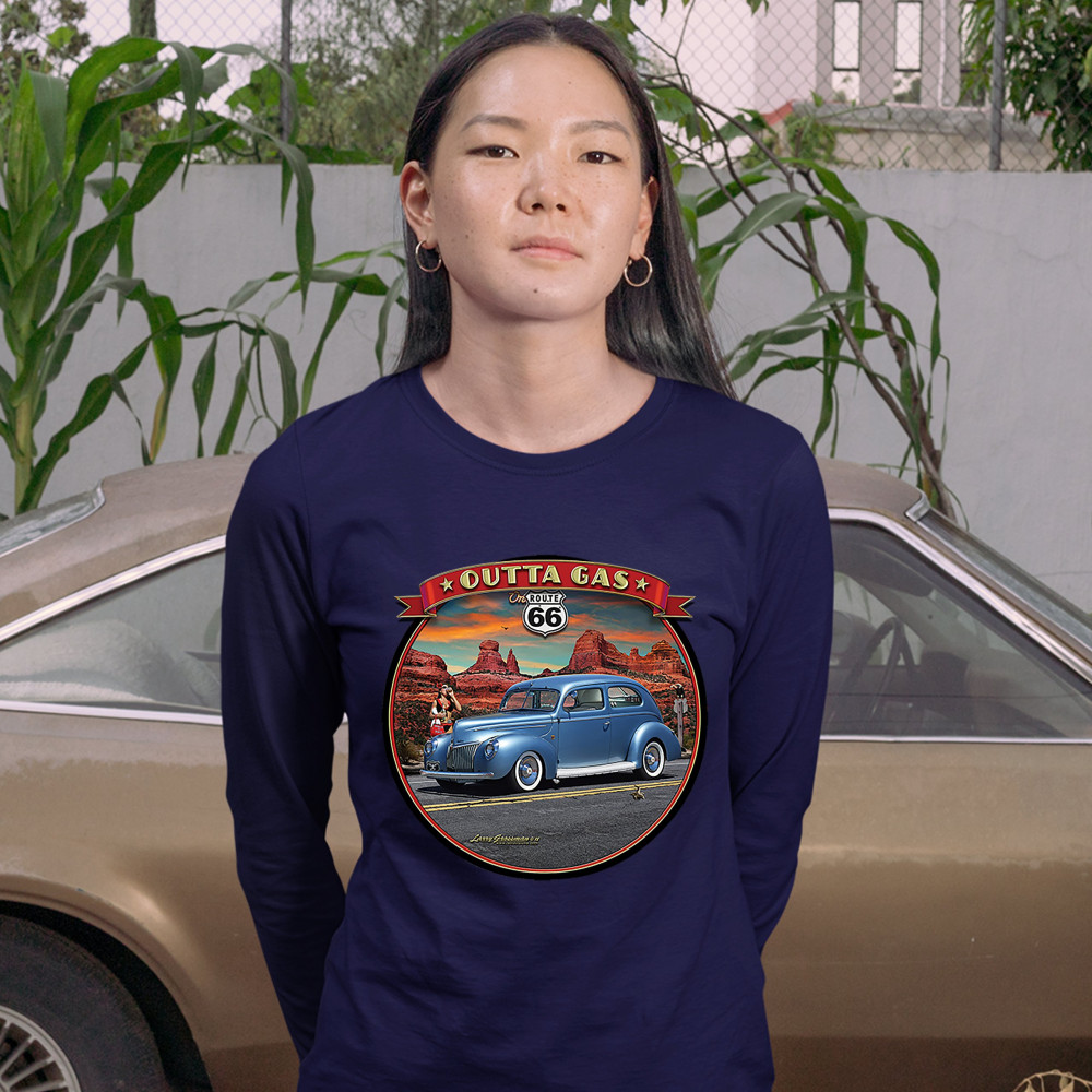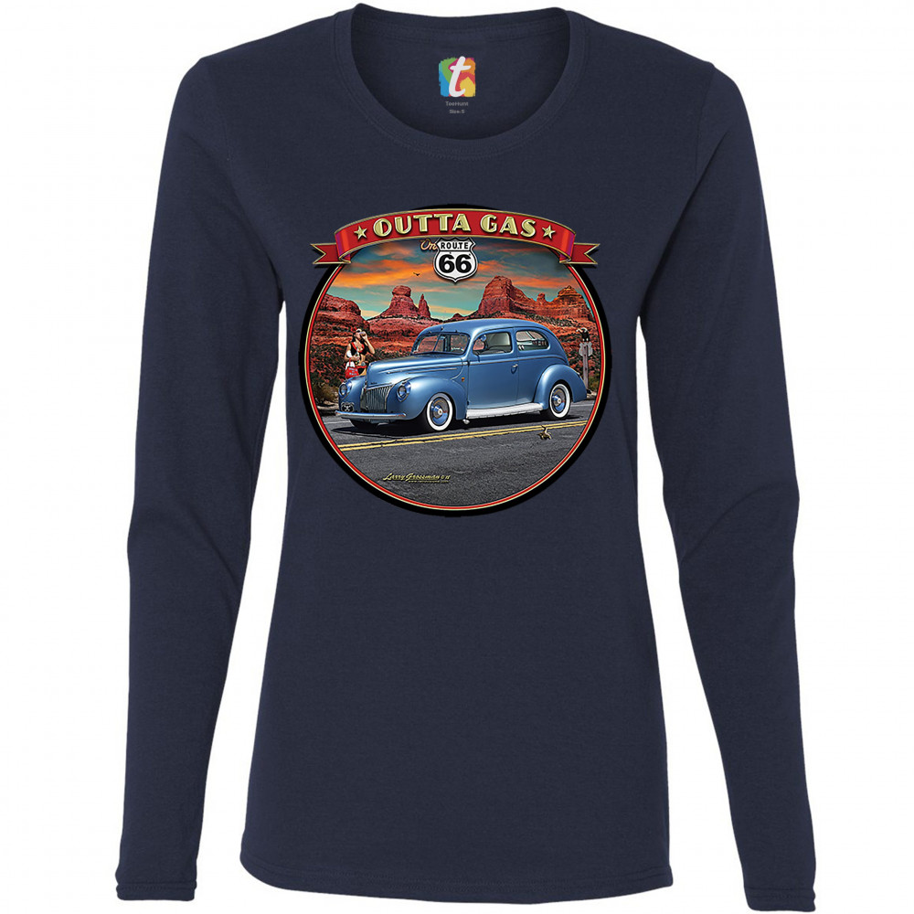 OUTTA GAS ON ROUTE 66 women's long sleeve t-shirt the mother road retro vintage navy blue
