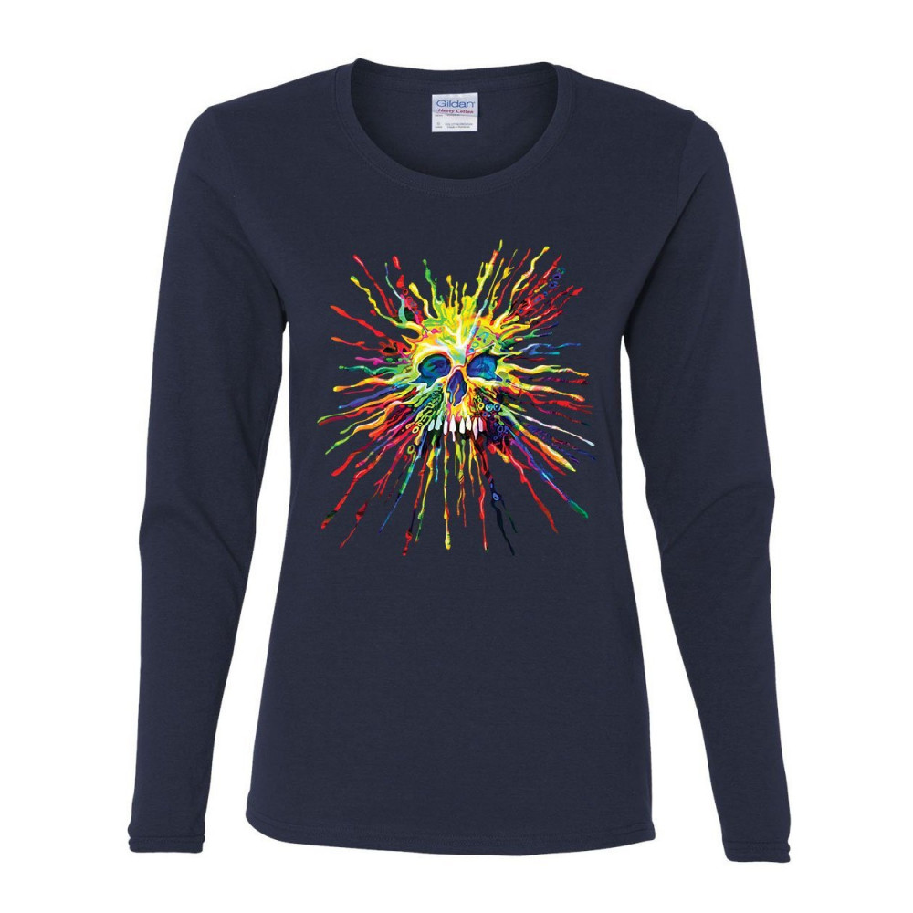 PAINT SPLATTER SKULL women's long sleeve tee multicolor art crazy melting drip navy blue