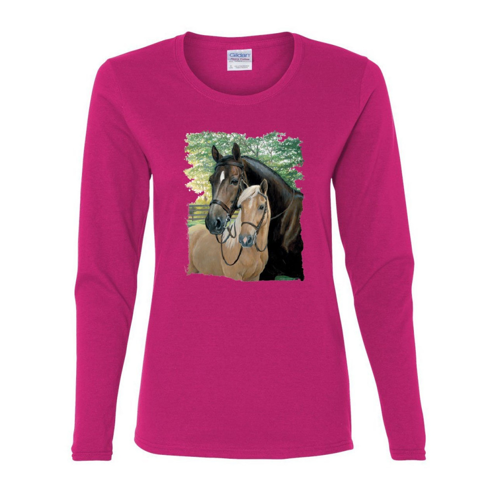 PAIR OF HORSES women's long sleeve tee mustangs horseback riding pony stallion hot pink