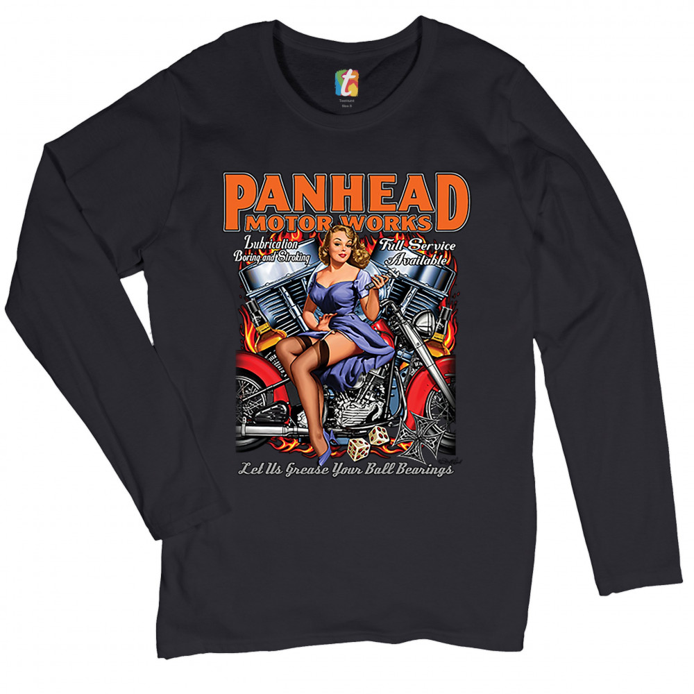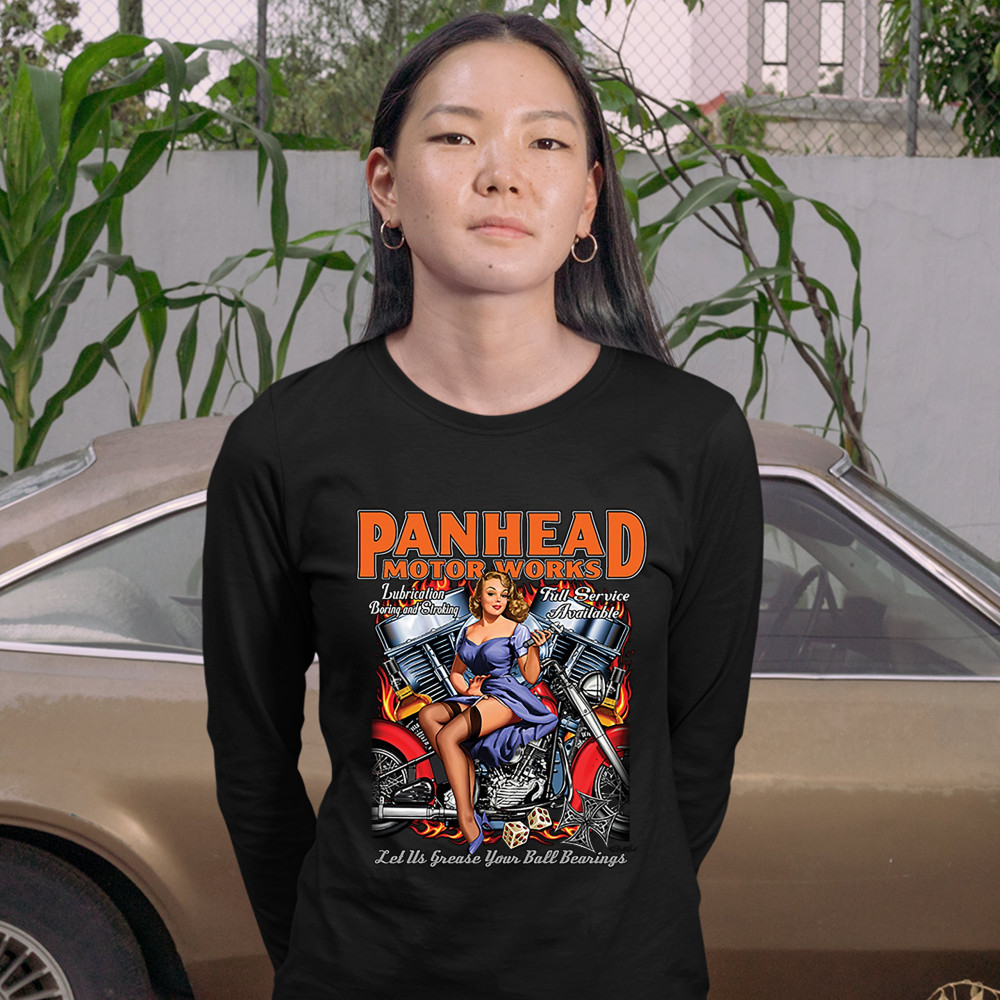 A print featuring a sexy pin-up girl sitting on a chopper motorcycle holding a wrench. In the background there is a V-engine. The print says: "Panhead motor works, Lubrication boring and stroking, Full service available, Let us grease your ball bearings".