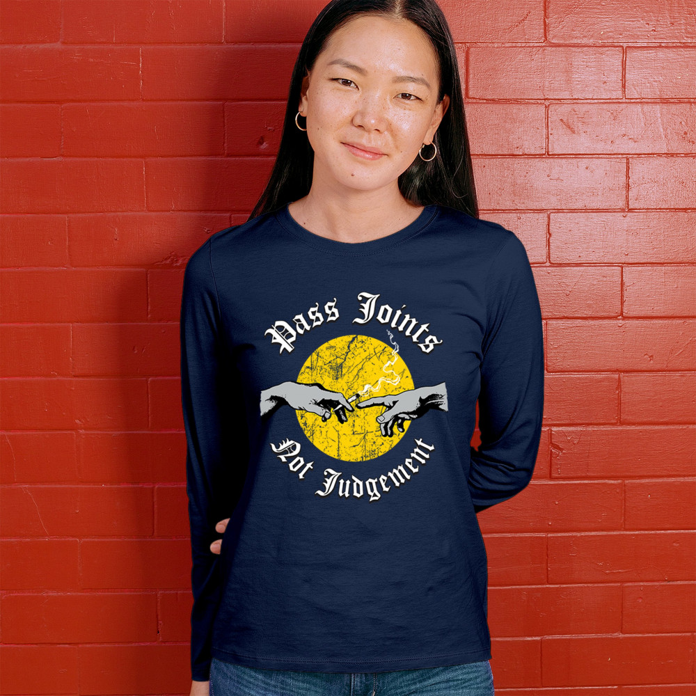 Cannabis culture twist on classic art. Hands passing a joint with “Pass Joints Not Judgement†message. Chill, bold, and unapologetically stoner.