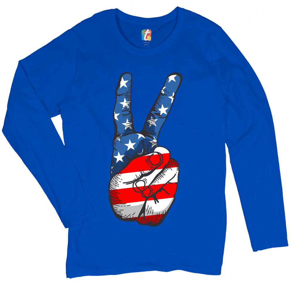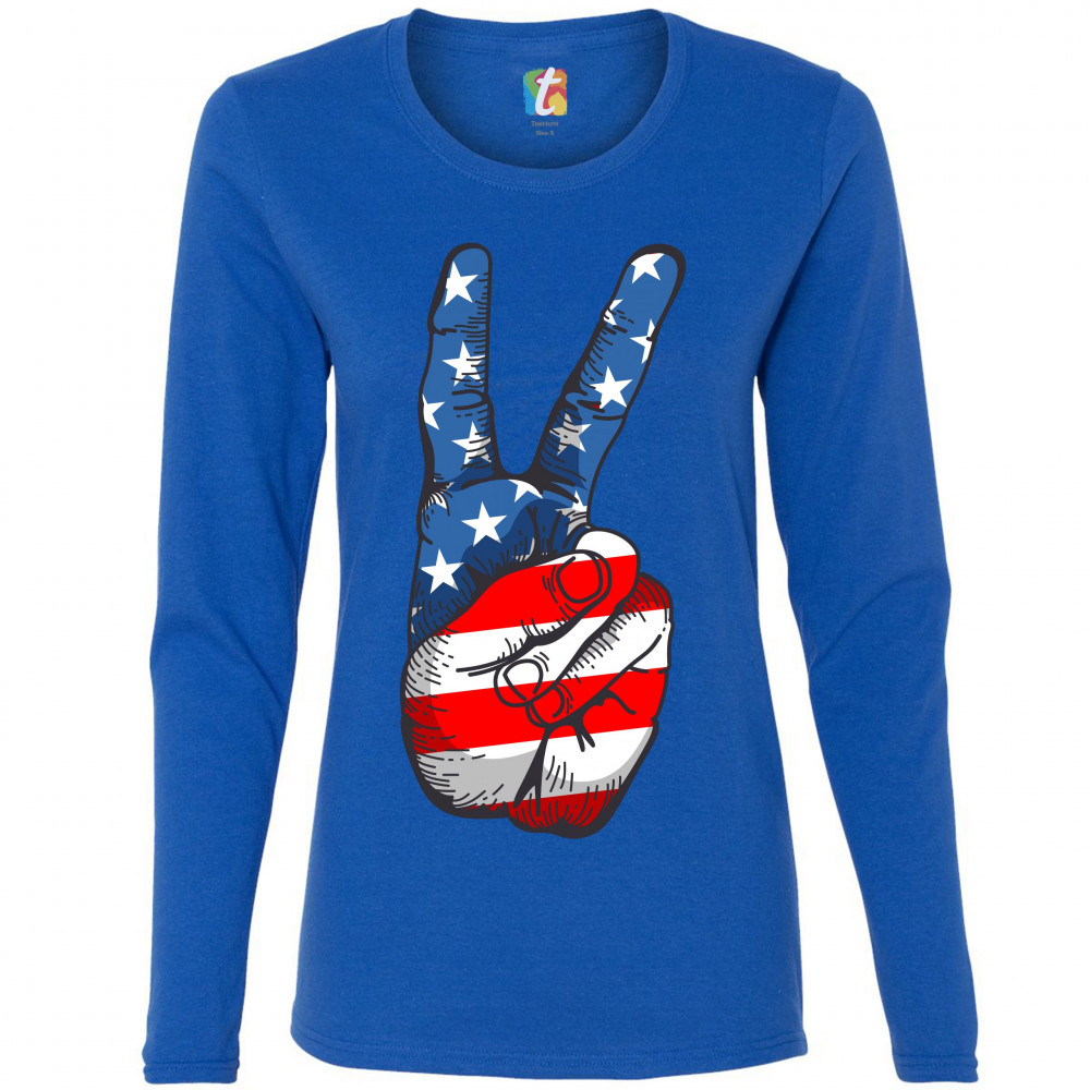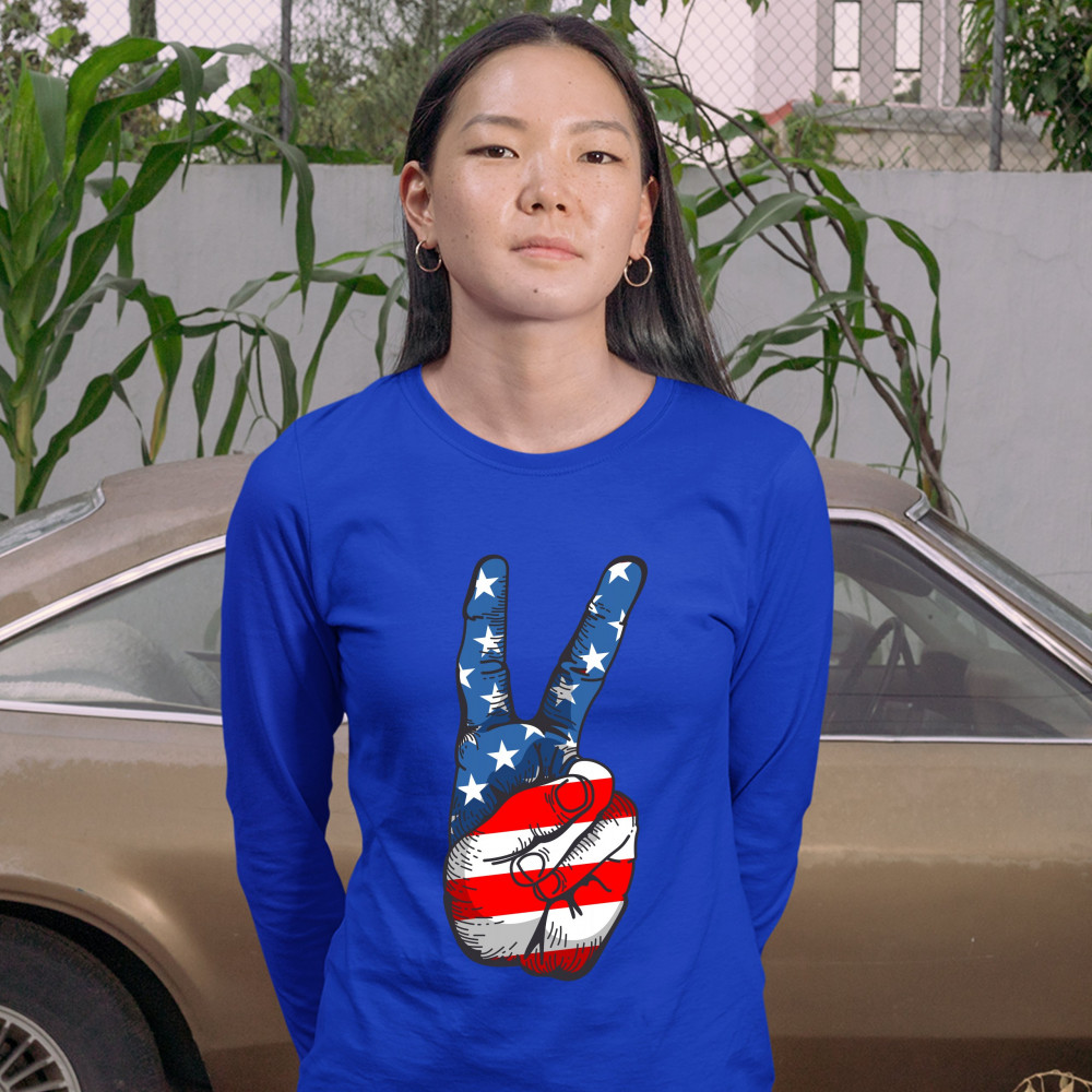 PATRIOTIC VICTORY SIGN women's long sleeve t-shirt american flag 4th of july royal blue