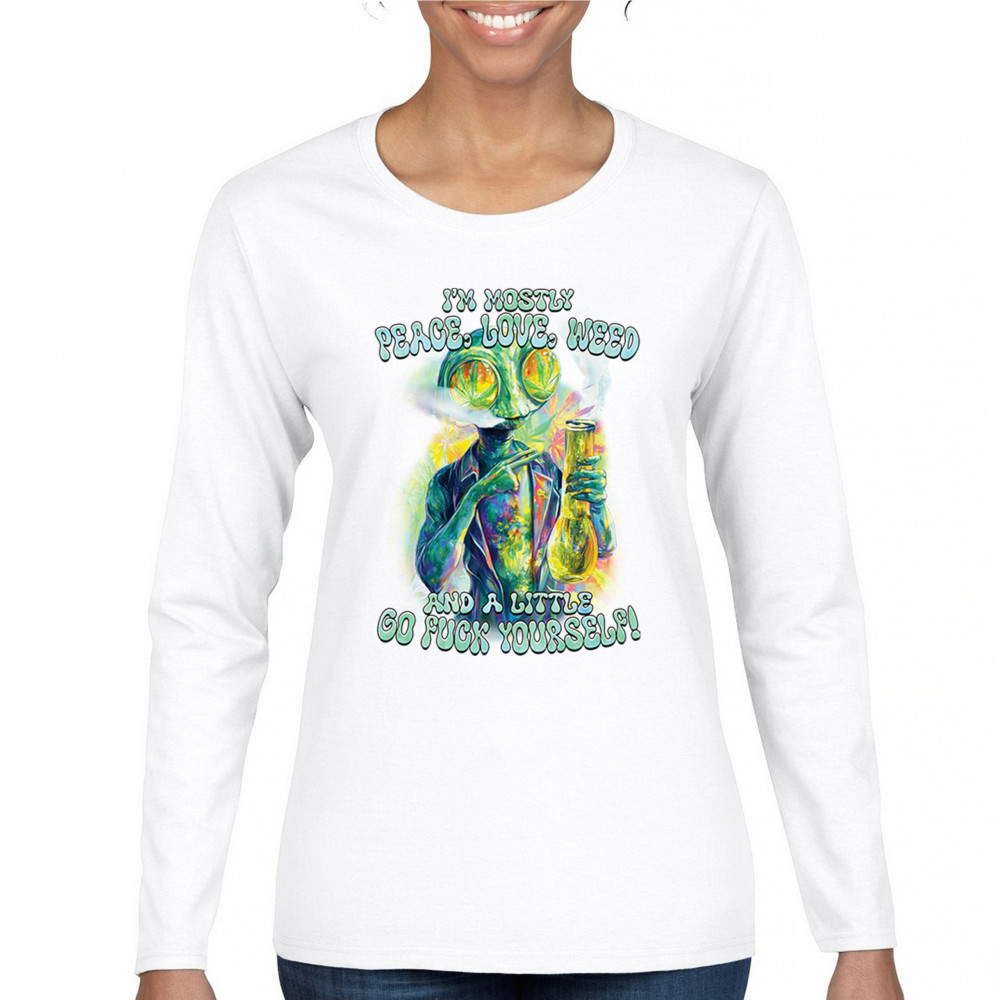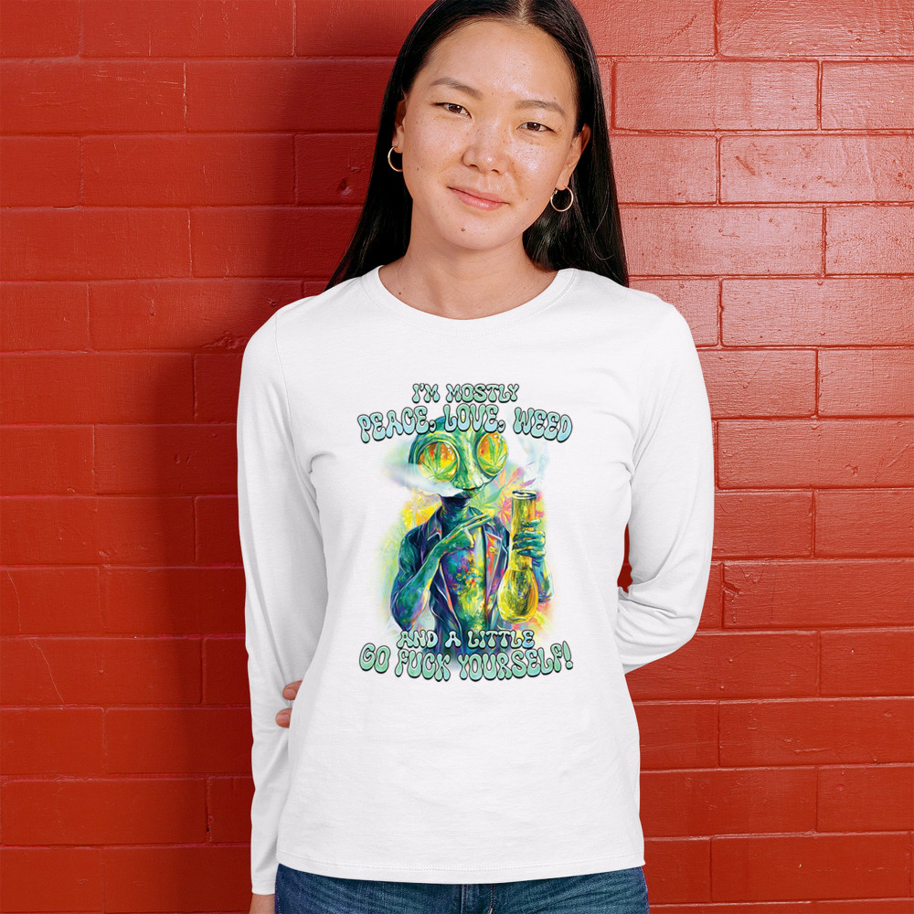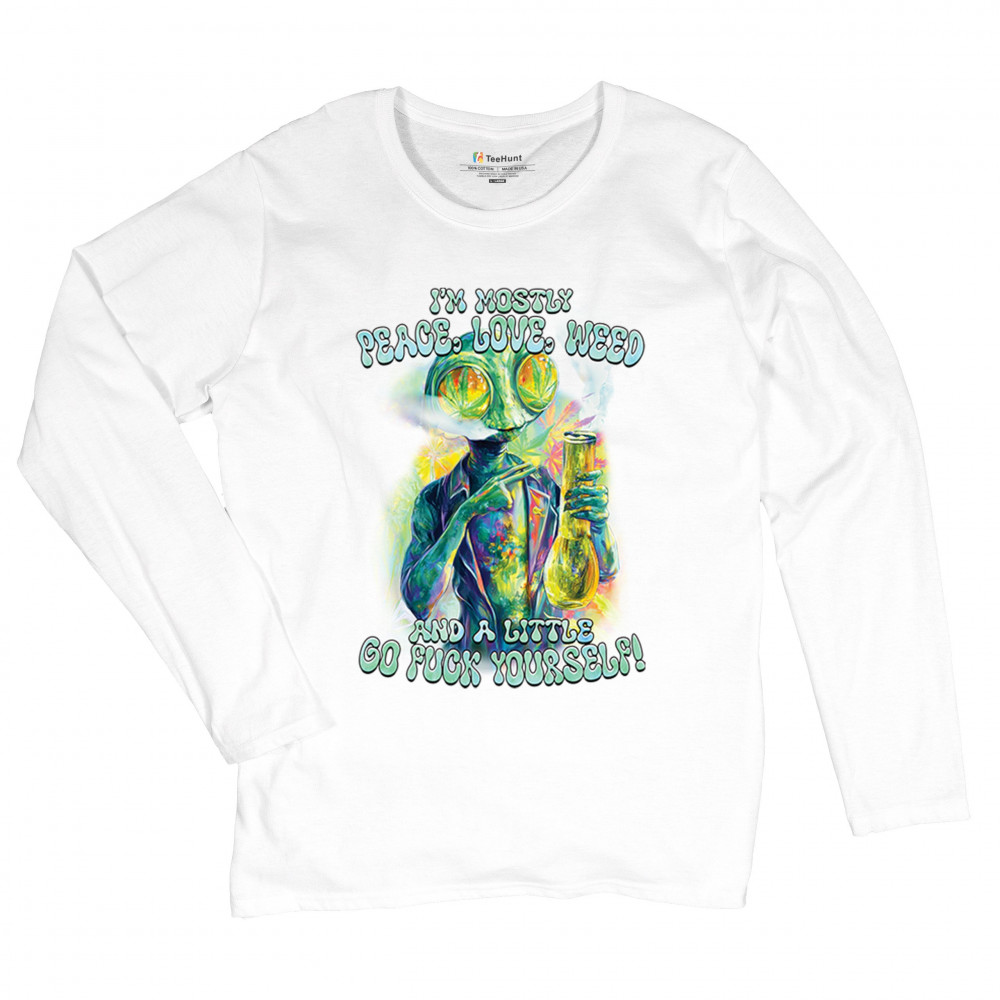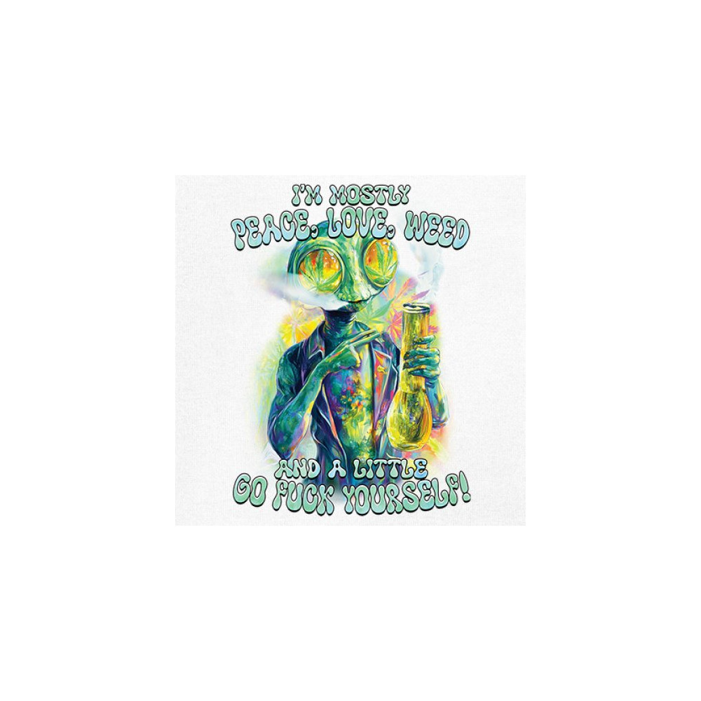 Bold alien cannabis design mixing humor, sarcasm, and weed culture—perfect for unapologetic smokers with attitude and peace vibes.