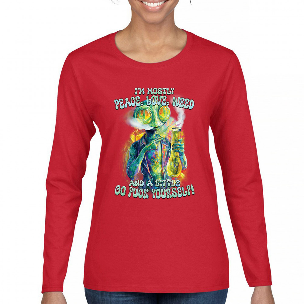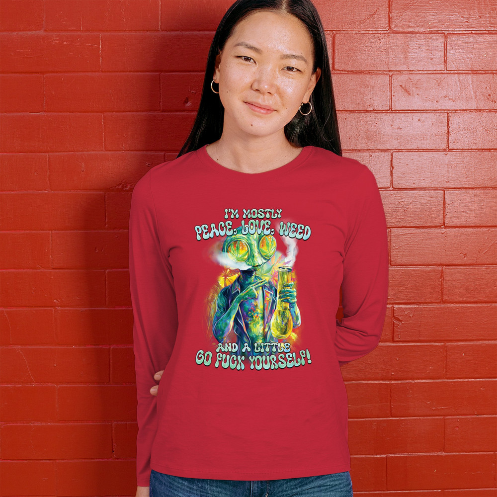 Bold alien cannabis design mixing humor, sarcasm, and weed culture—perfect for unapologetic smokers with attitude and peace vibes.