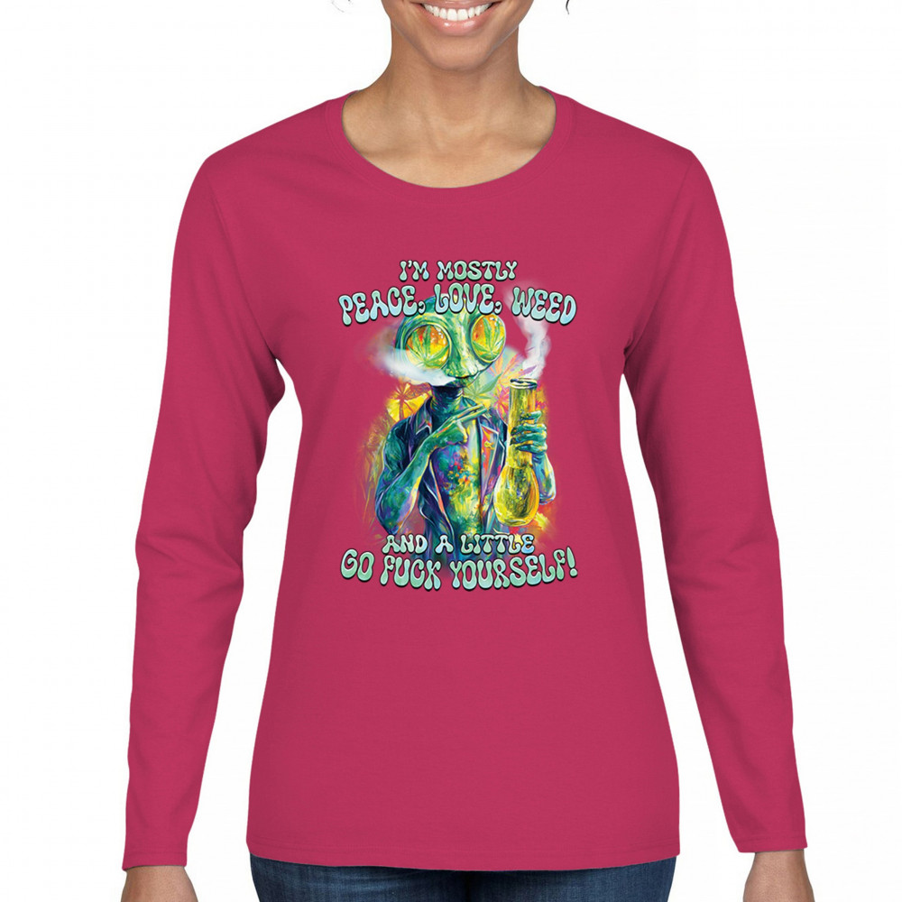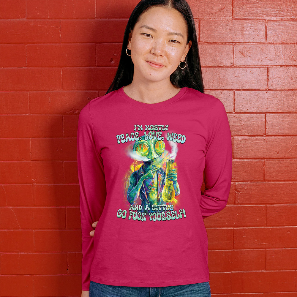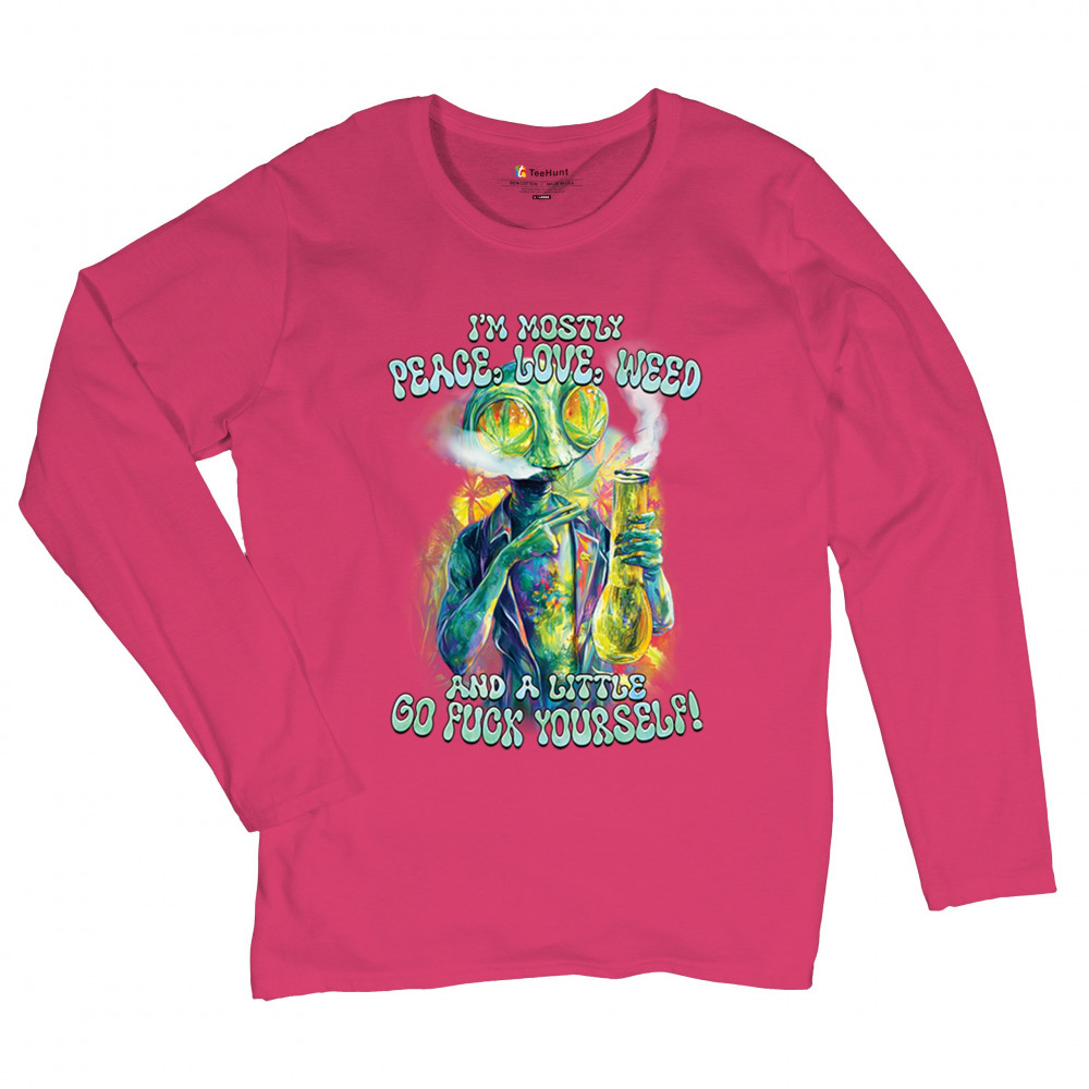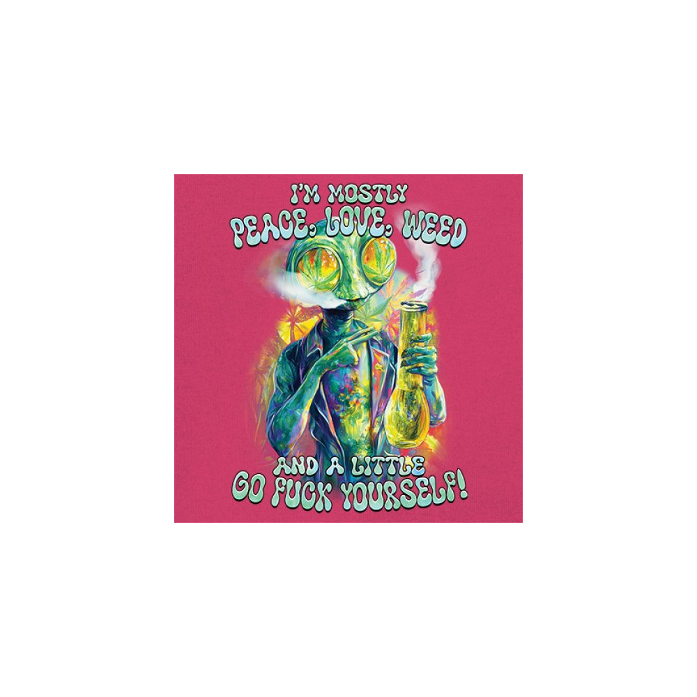 Bold alien cannabis design mixing humor, sarcasm, and weed culture—perfect for unapologetic smokers with attitude and peace vibes.