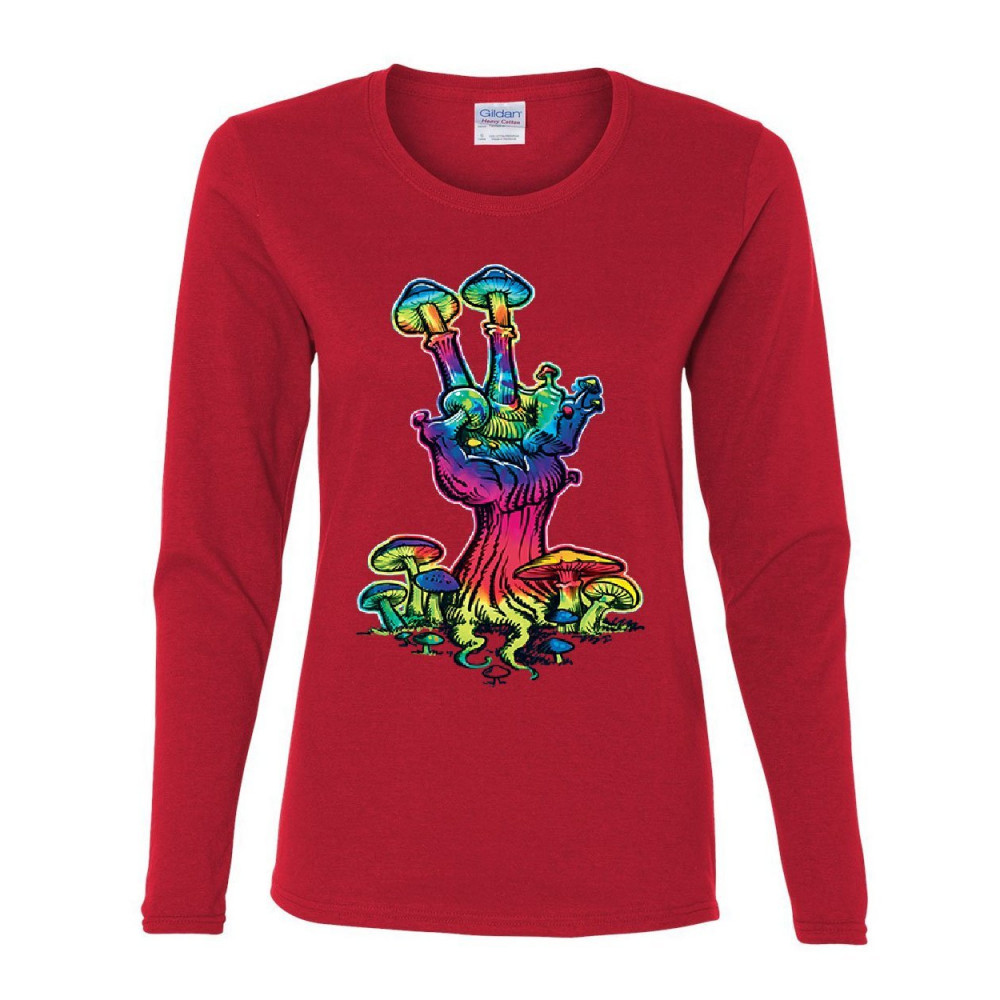 MUSHROOM PEACE peace mushroom women's long sleeve tee shroom hippie fungi colorful neon love red