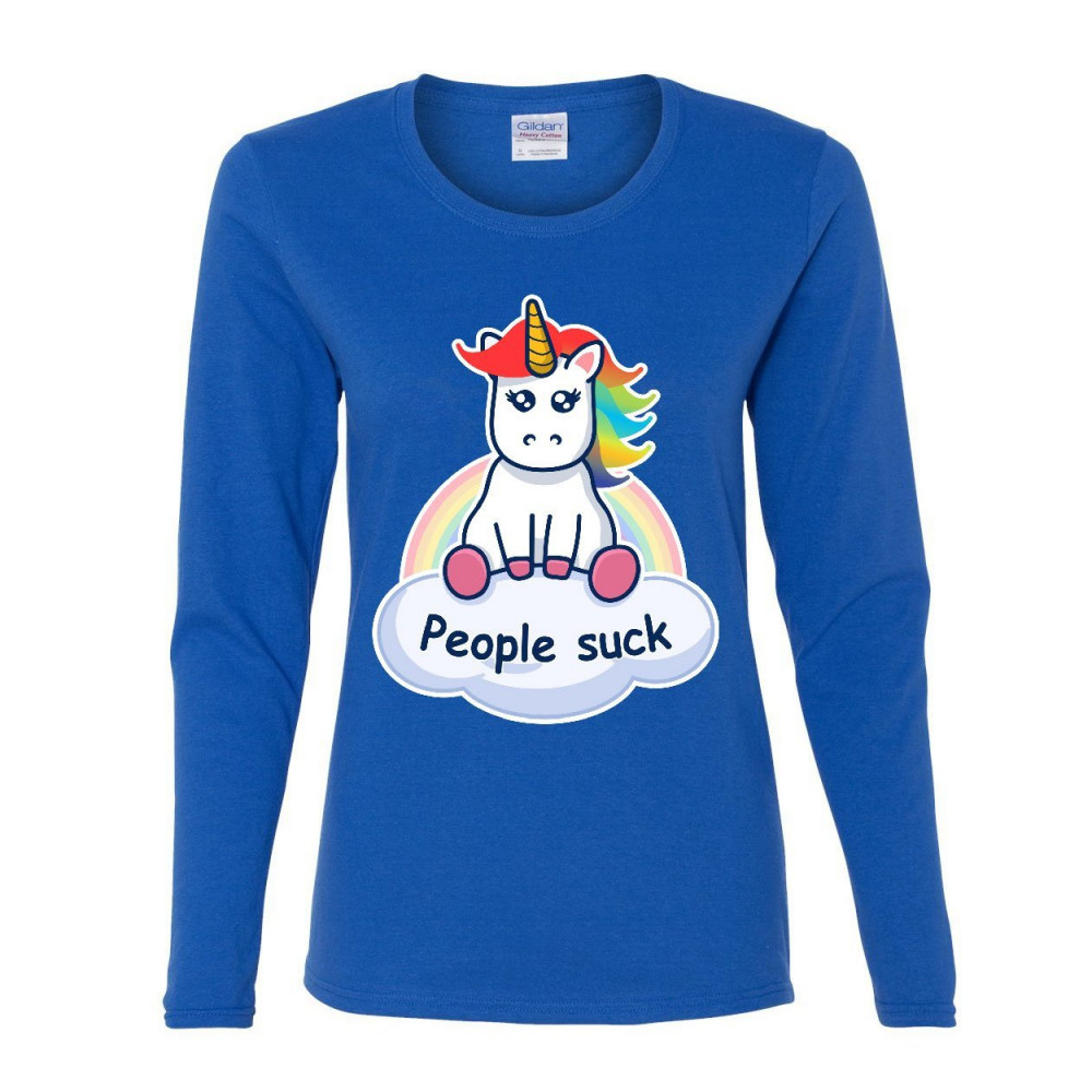 PEOPLE SUCK cute unicorn women's long sleeve tee funny rainbow pony introvert royal blue