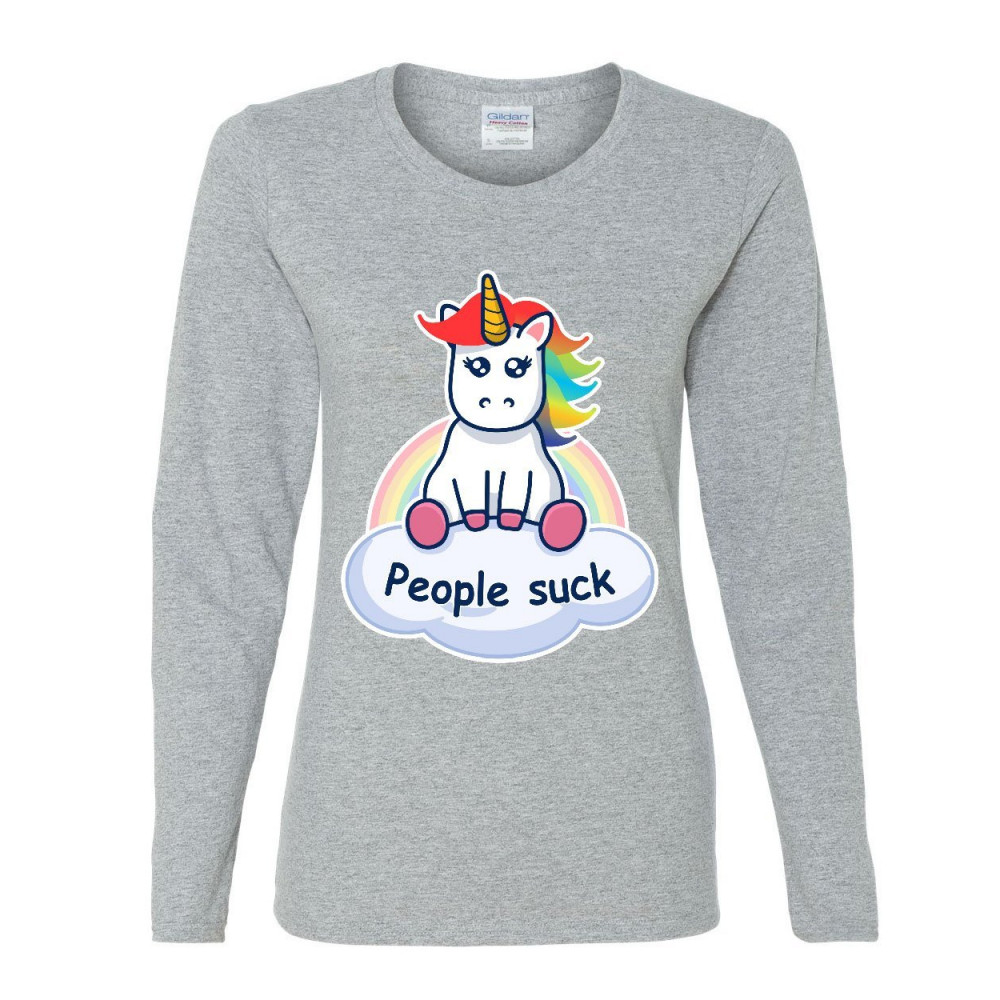 PEOPLE SUCK cute unicorn women's long sleeve tee funny rainbow pony introvert gray