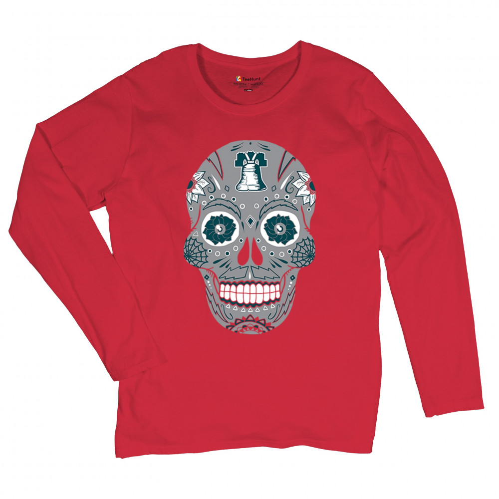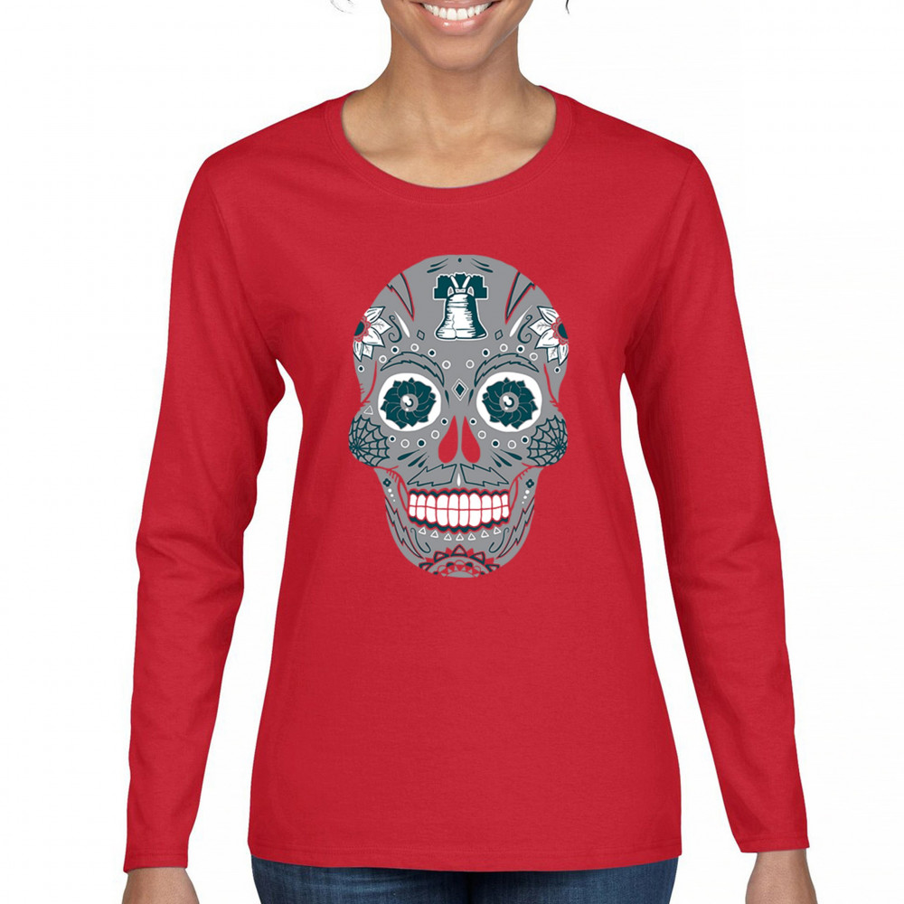 Philly meets tradition in this Sugar Skull design, mixing calavera art with the iconic liberty bell and marigold flowers. Perfect for Philly sports culture, fantasy league energy, or game day skull vibes, it captures Philly gothic art and fan zone spirit. A unique way to honor Dia de los Muertos while showing local Philadelphia pride and heritage in bold style.