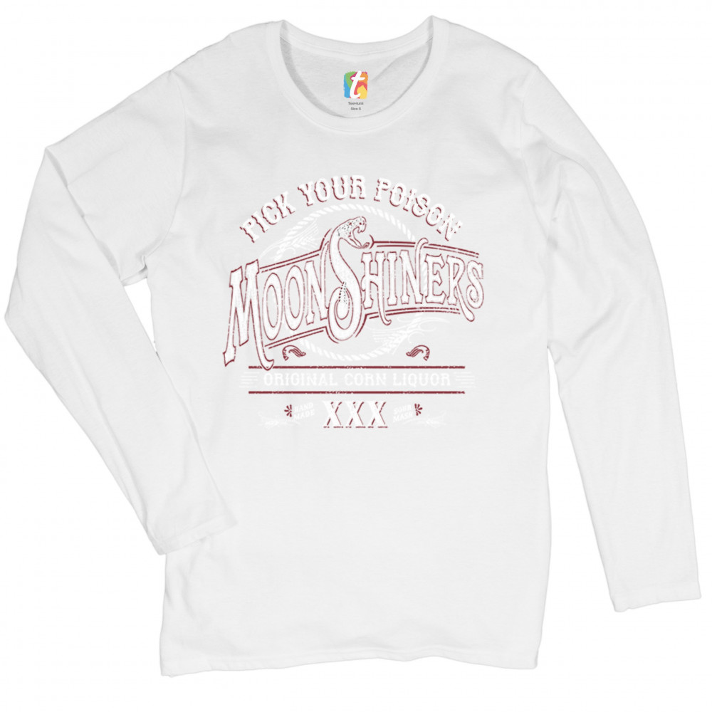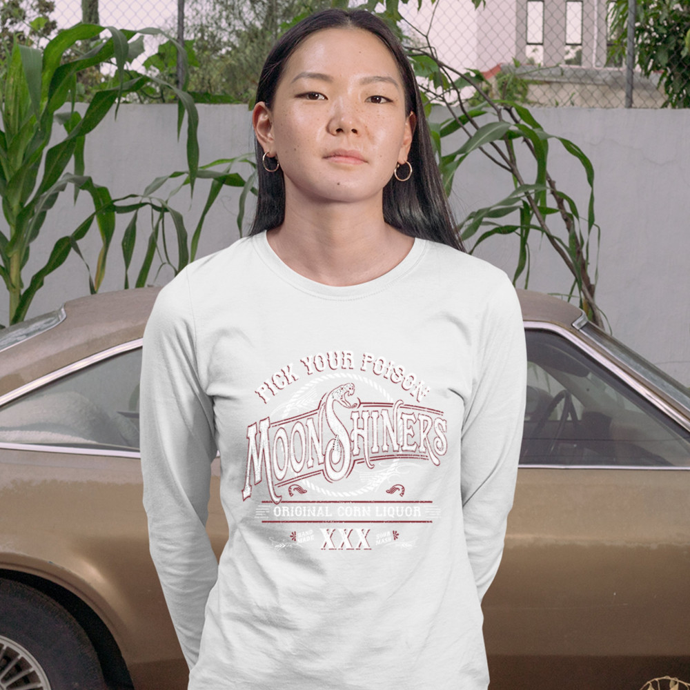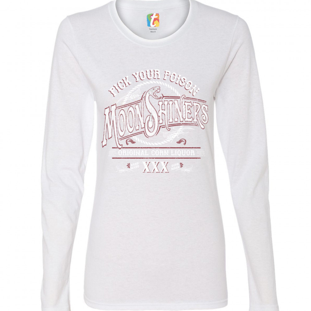 PICK YOUR POISON MOONSHINERS women's long sleeve t-shirt original corn liquor white