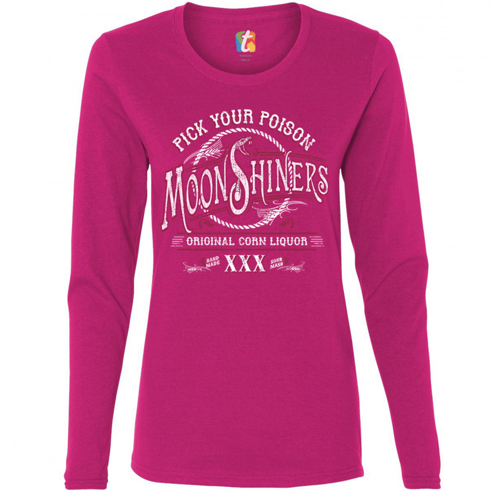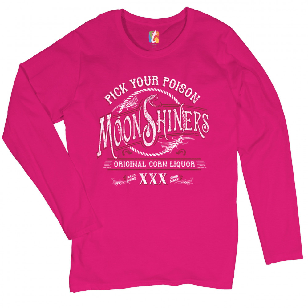 PICK YOUR POISON MOONSHINERS women's long sleeve t-shirt original corn liquor pink