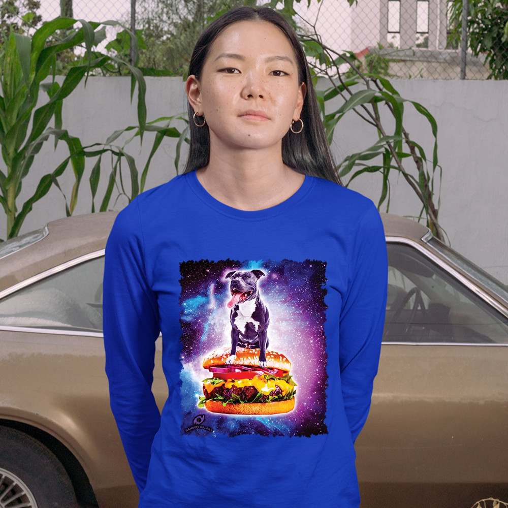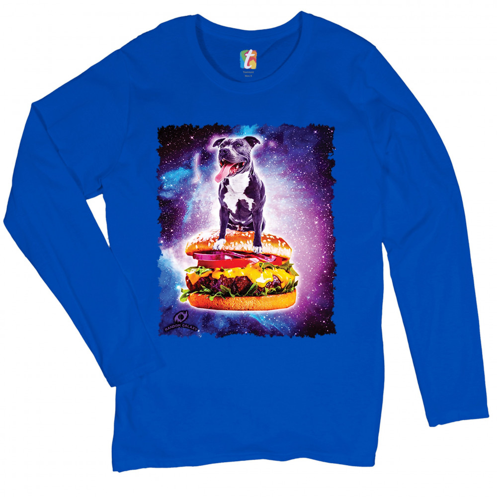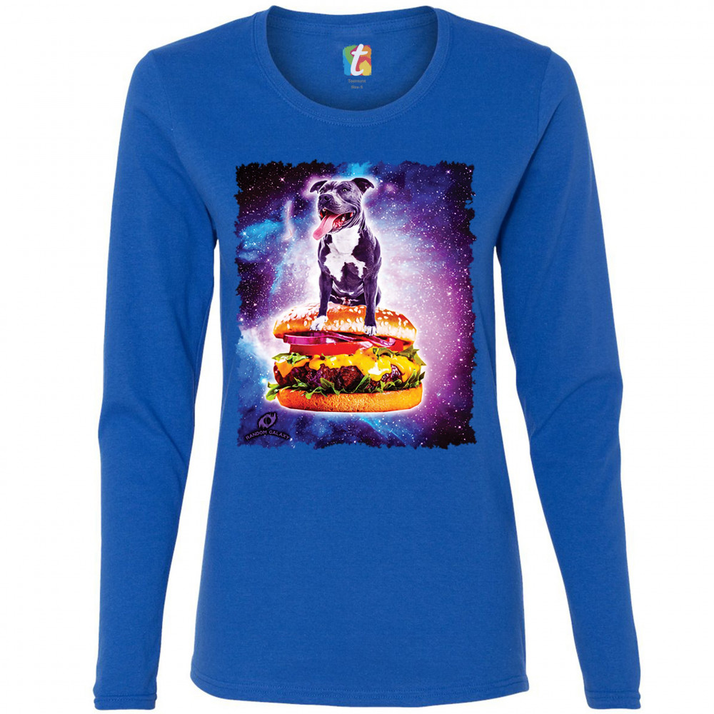 PIT BULL RIDING A BURGER FLYING THROUGH GALAXY women's long sleeve t-shirt dog royal blue