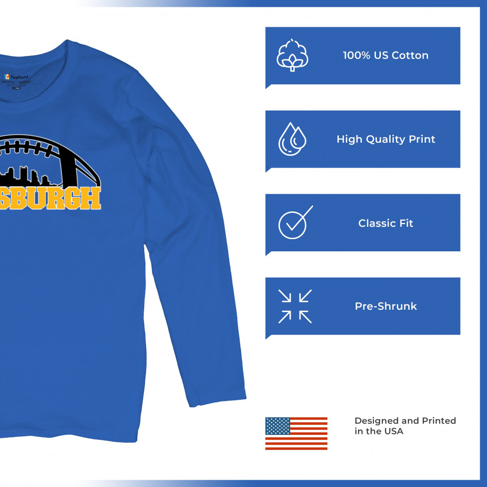 Embrace your Steel City pride with this bold Pittsburgh-themed design, showcasing the city skyline in a unique football graphic. Perfect for game day celebrations, tailgating parties, or everyday wear, this design captures the energy and passion of Pittsburgh's legendary sports culture. Whether you're cheering on your favorite team or representing your city, this design is a must-have for Pittsburgh fans.
