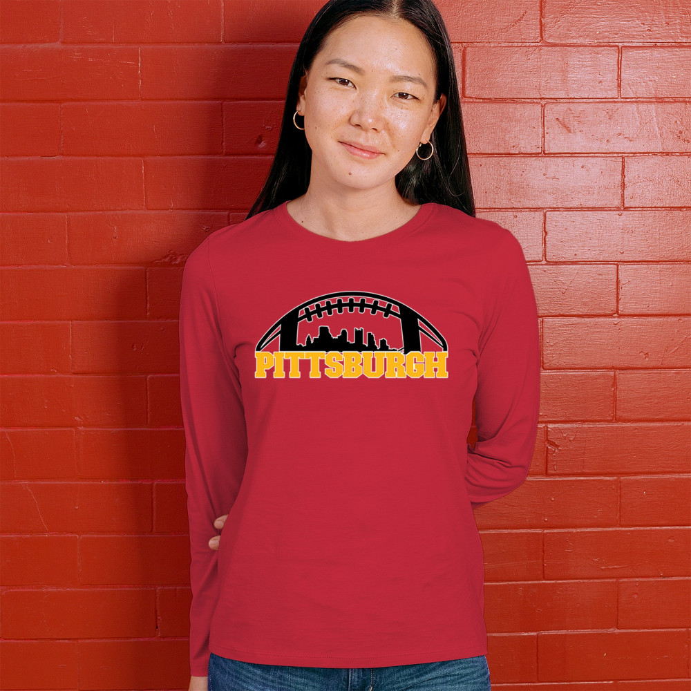Embrace your Steel City pride with this bold Pittsburgh-themed design, showcasing the city skyline in a unique football graphic. Perfect for game day celebrations, tailgating parties, or everyday wear, this design captures the energy and passion of Pittsburgh's legendary sports culture. Whether you're cheering on your favorite team or representing your city, this design is a must-have for Pittsburgh fans.