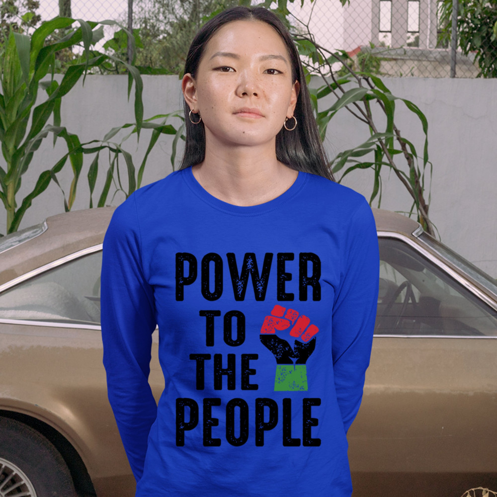 A print saying: "Power to the People". The print features a fist painted in Pan-African colors. Great choice to wear to spread an important message.