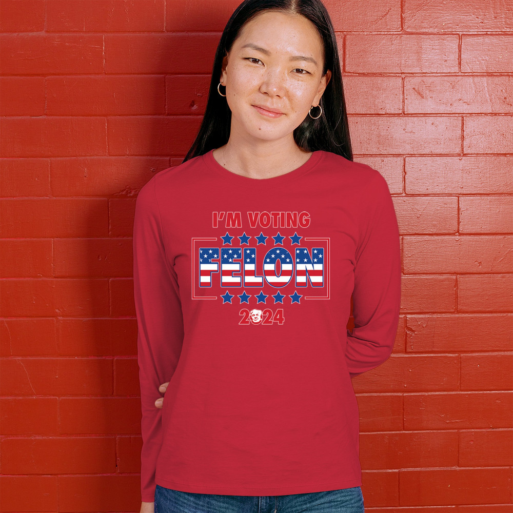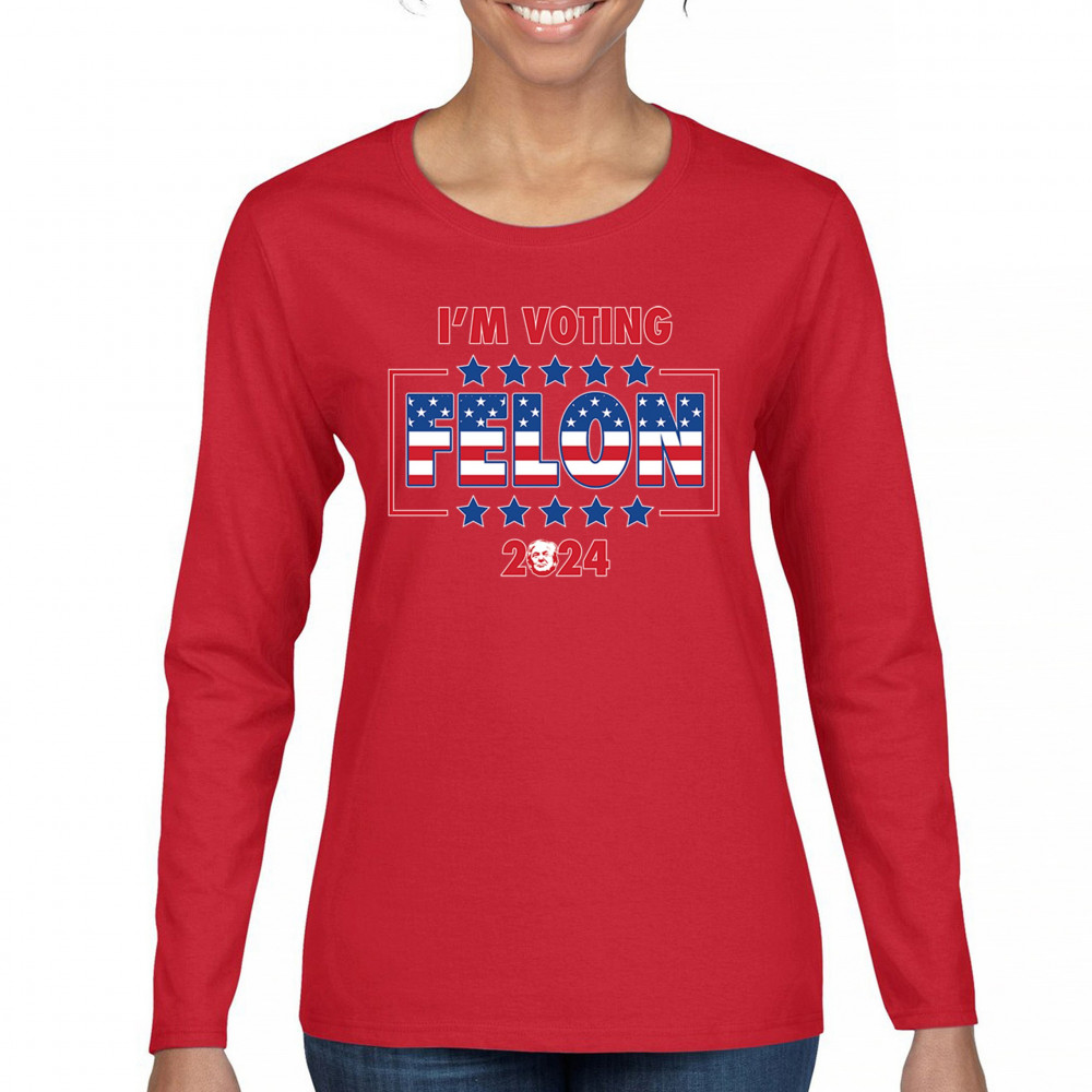 Show your support with the "I'm Voting Felon 2024" design, perfect for conservative patriots and Trump supporters. Featuring an American flag motif.