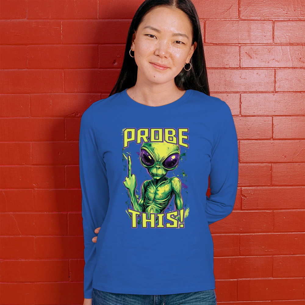 Alien attitude goes full throttle in this rebellious design featuring a defiant extraterrestrial flipping the bird. Bold green and purple tones amplify the sarcasm, making it perfect for UFO fans, protest vibes, and anyone with a dark sense of humor. Wear it loud to alien fests, parties, or anytime you want to stir the stars.