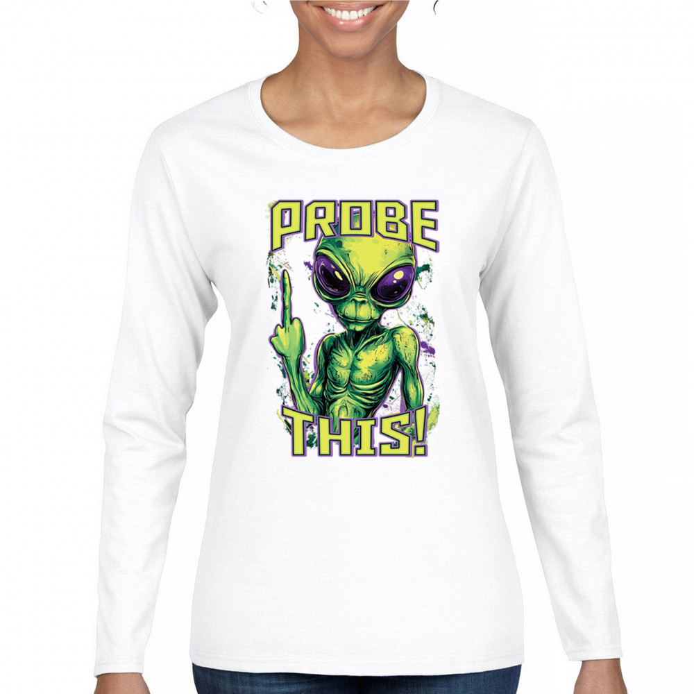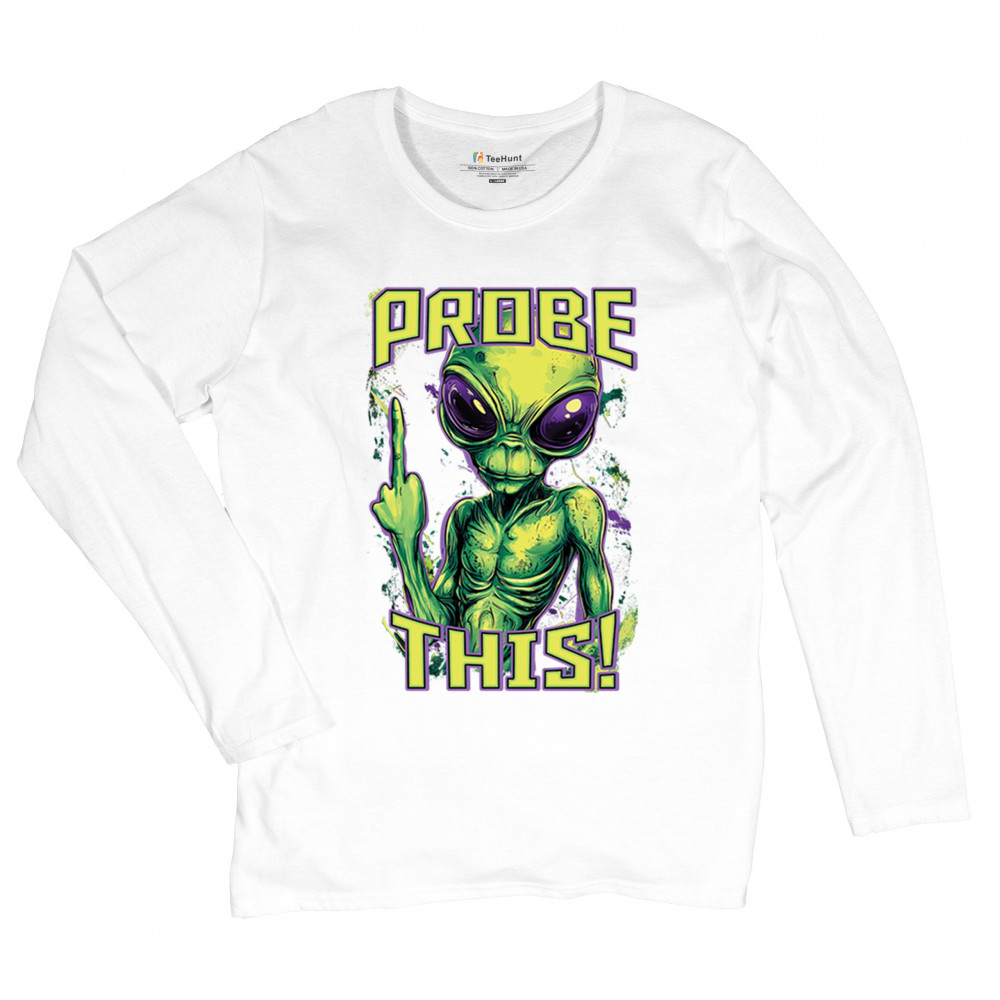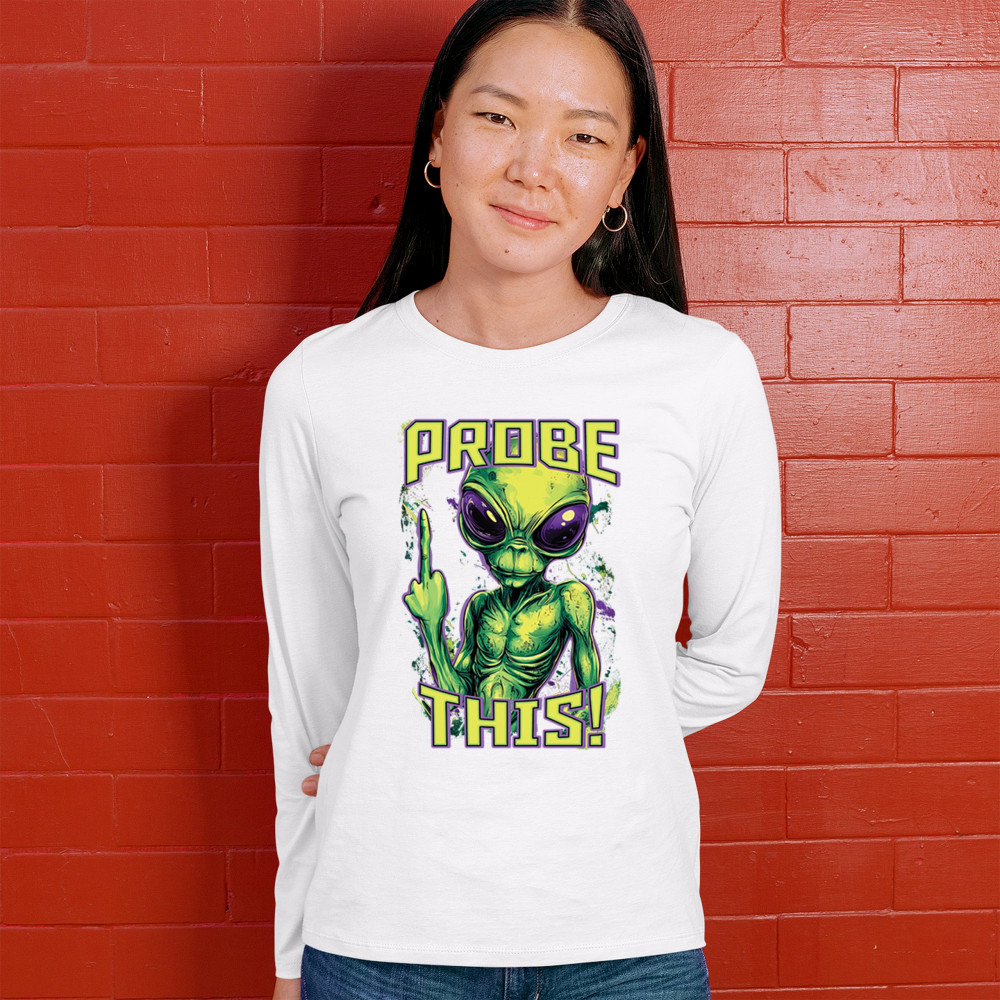 Alien attitude goes full throttle in this rebellious design featuring a defiant extraterrestrial flipping the bird. Bold green and purple tones amplify the sarcasm, making it perfect for UFO fans, protest vibes, and anyone with a dark sense of humor. Wear it loud to alien fests, parties, or anytime you want to stir the stars.