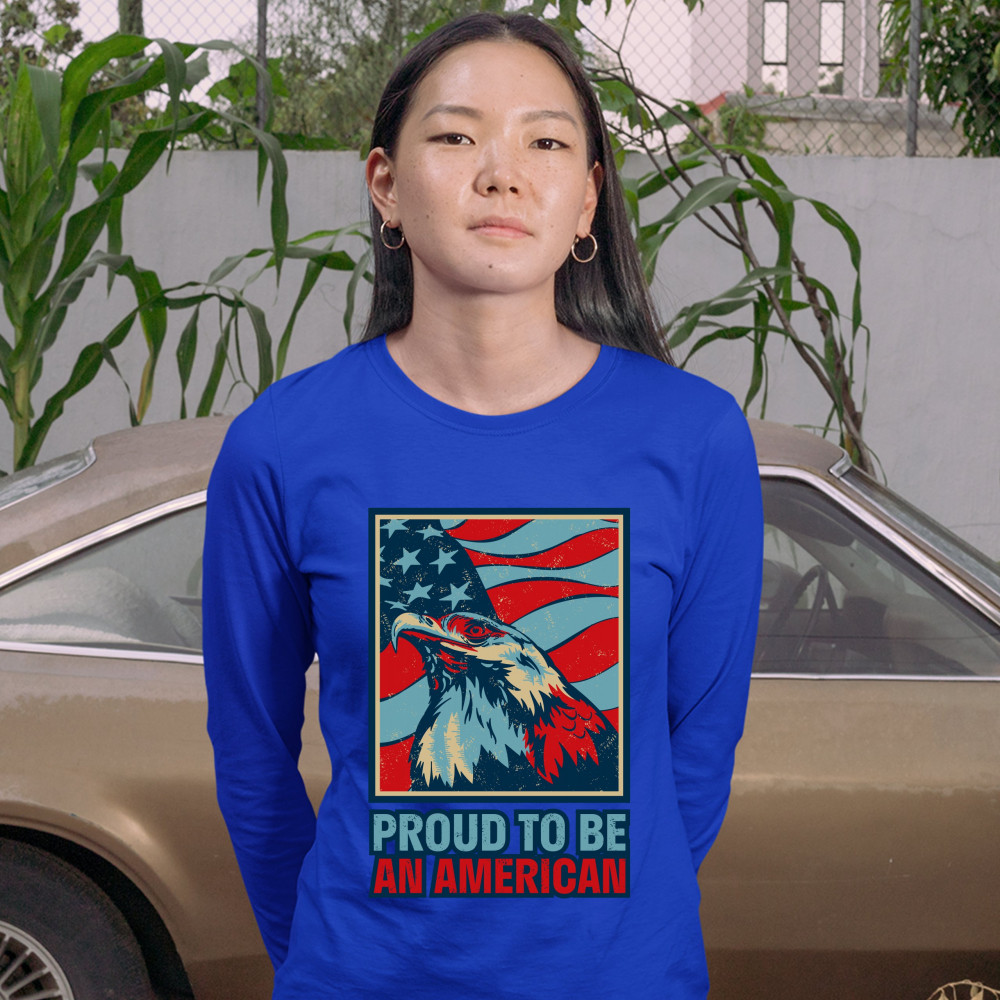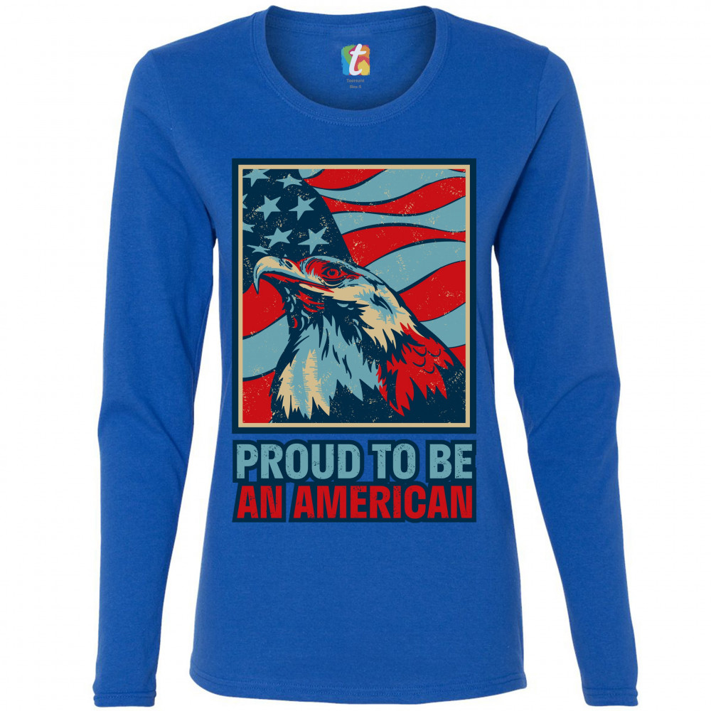 PROUD TO BE AN AMERICAN women's long sleeve t-shirt 4th of july bald eagle usa royal blue