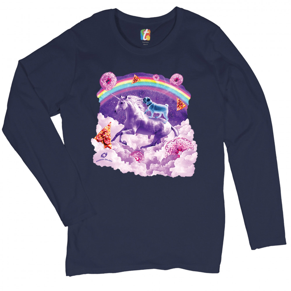 PUG RIDING A UNICORN IN CLOUDS women's long sleeve t-shirt space rainbow donuts navy blue