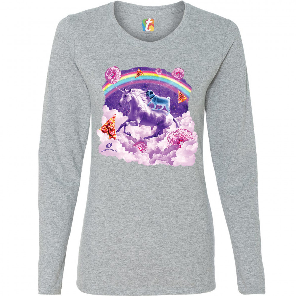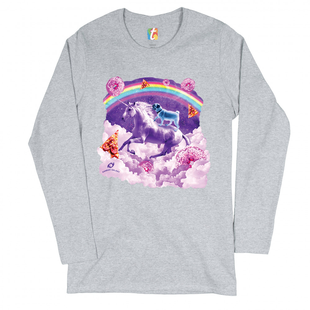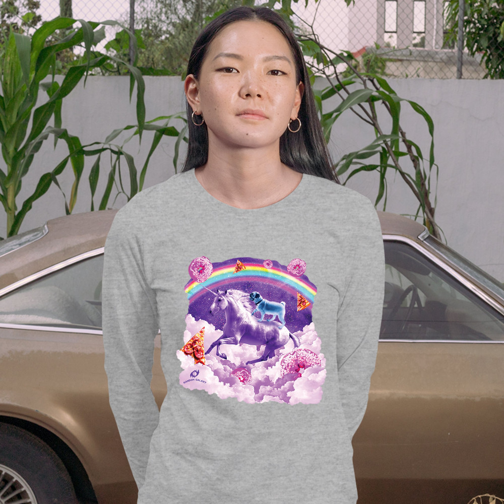 A beautiful print featuring a pug standing on a back of a unicorn galloping through clouds. In the background a rainbow crossing the space is seen. Across the clouds numerous pizza slices and donuts are scattered. A great choice for a person who loves pug