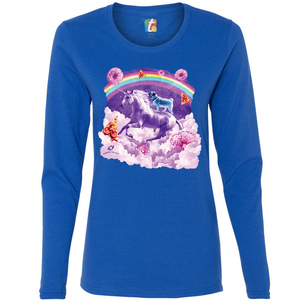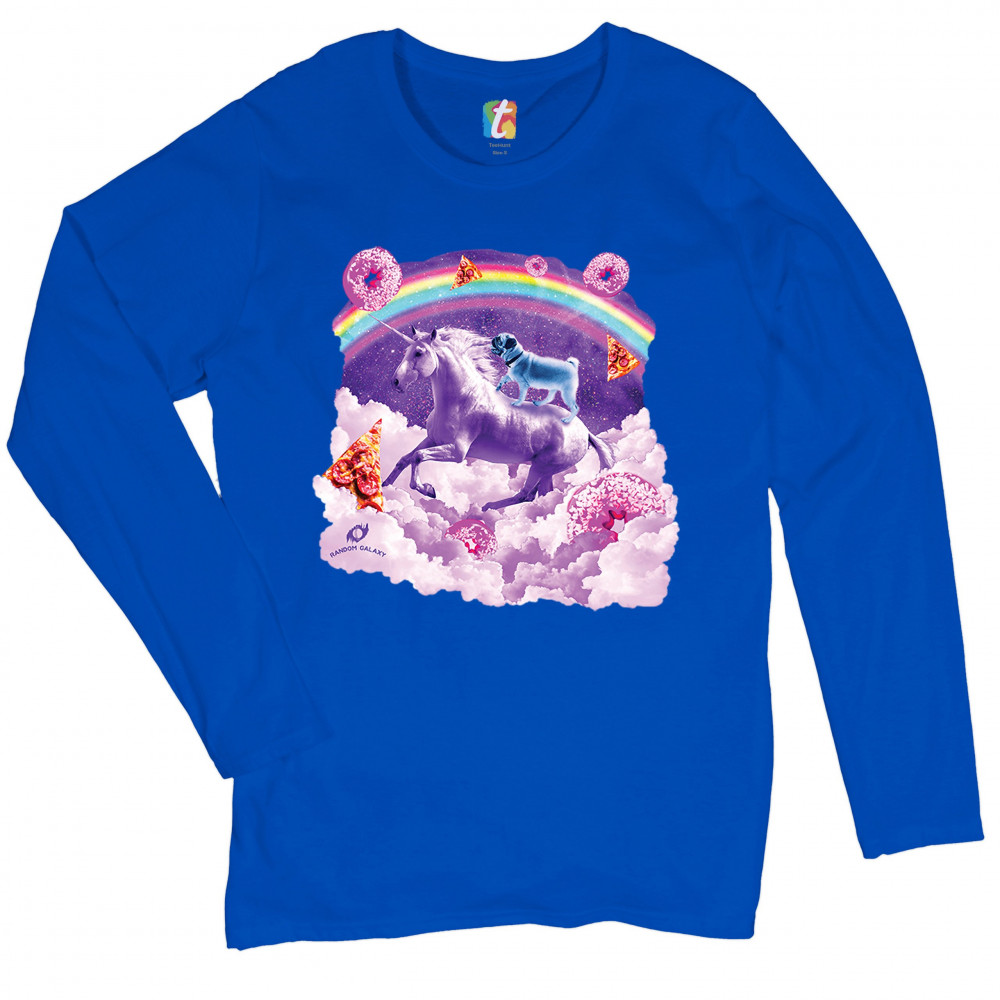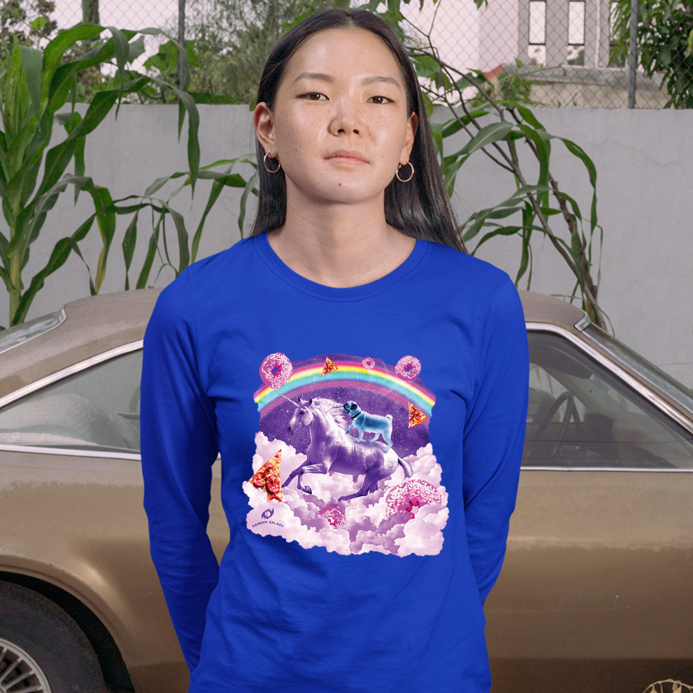 PUG RIDING A UNICORN IN CLOUDS women's long sleeve t-shirt space rainbow donuts royal blue