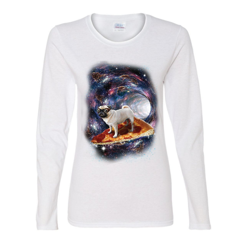PUG SPACE PIZZA SURFER women's long sleeve tee weird goggles galaxy dog lovers white