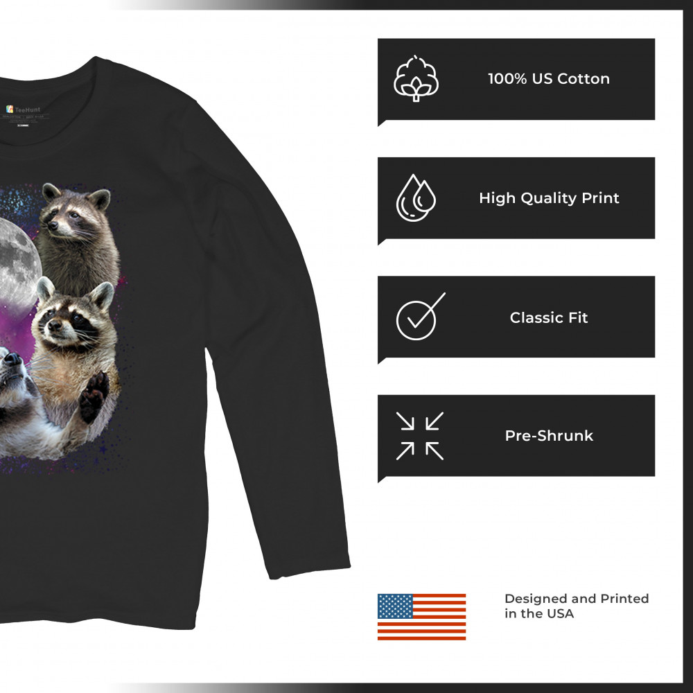 Embrace nature with this quirky raccoon and moon design, perfect for space and animal lovers. Ideal for casual wear or gifts.
