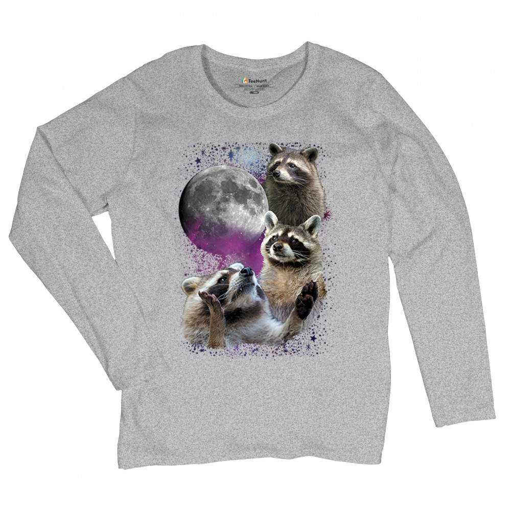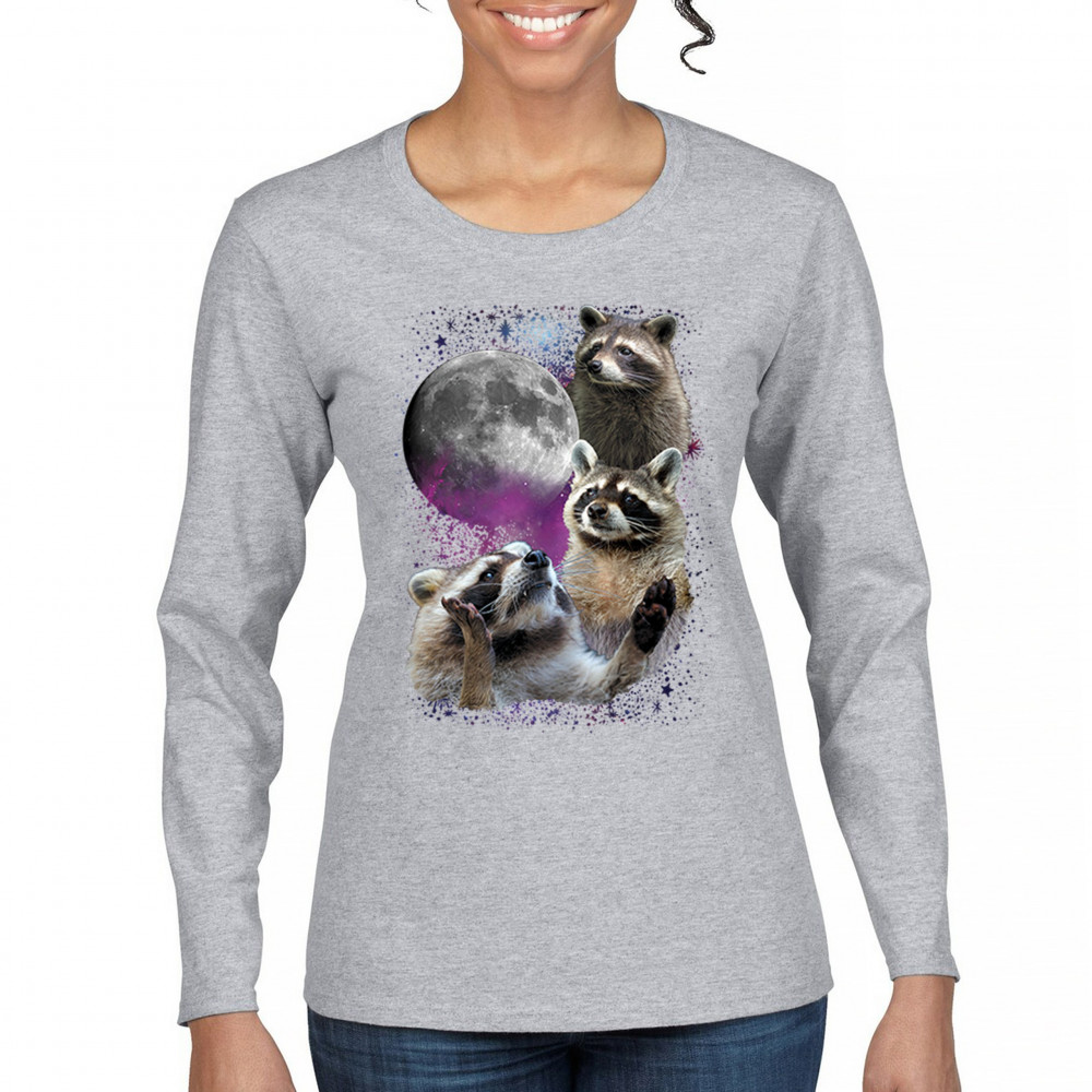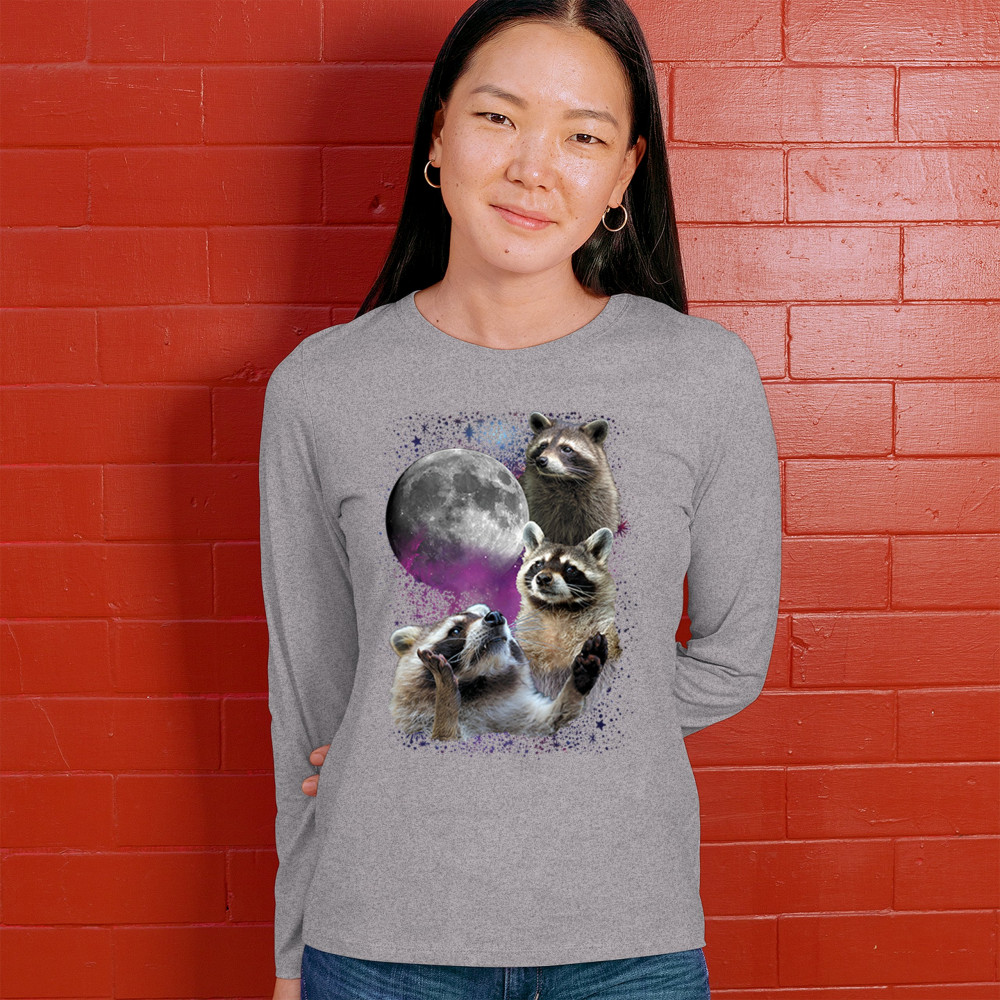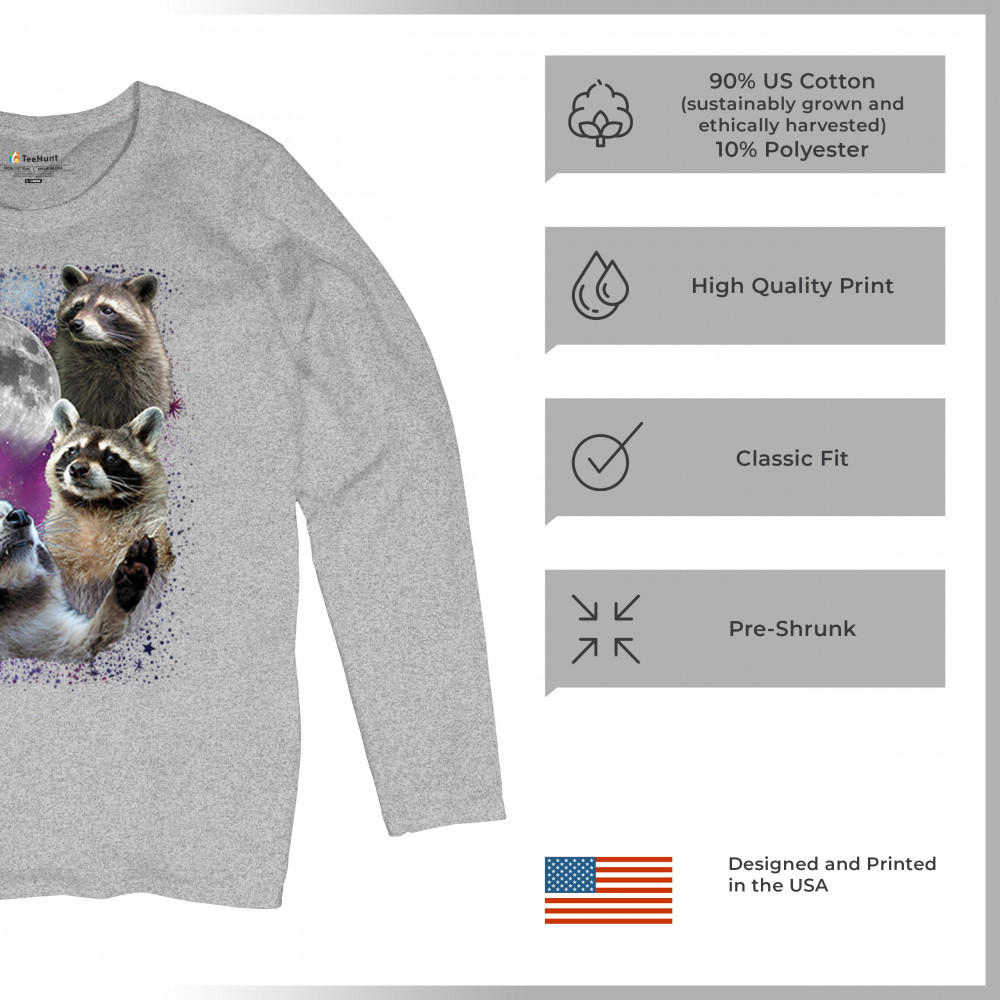 Embrace nature with this quirky raccoon and moon design, perfect for space and animal lovers. Ideal for casual wear or gifts.