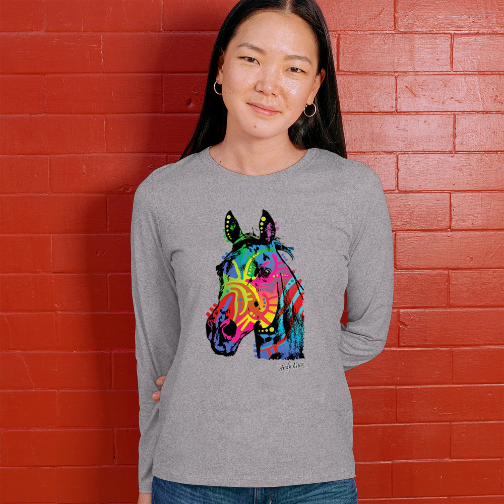 Bold rainbow horse head design with abstract pop art style. Great for equestrians, color lovers, and fans of modern animal artwork.