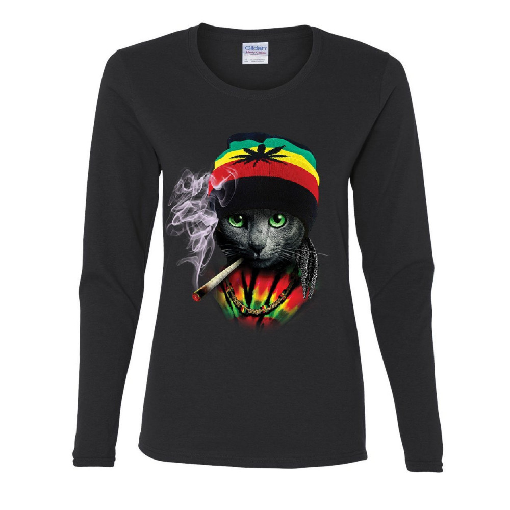 RASTA CAT women's long sleeve tee smoking joint 420 jamaica marijuana pot weed black