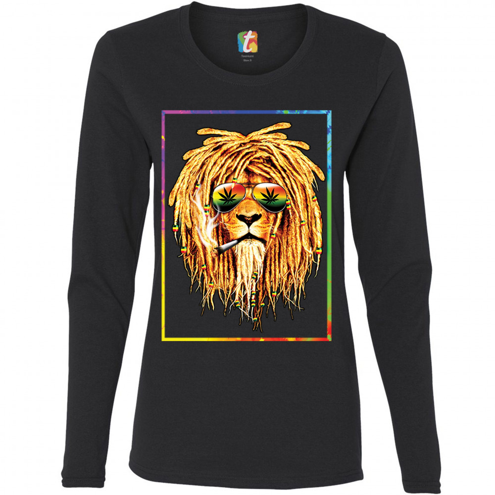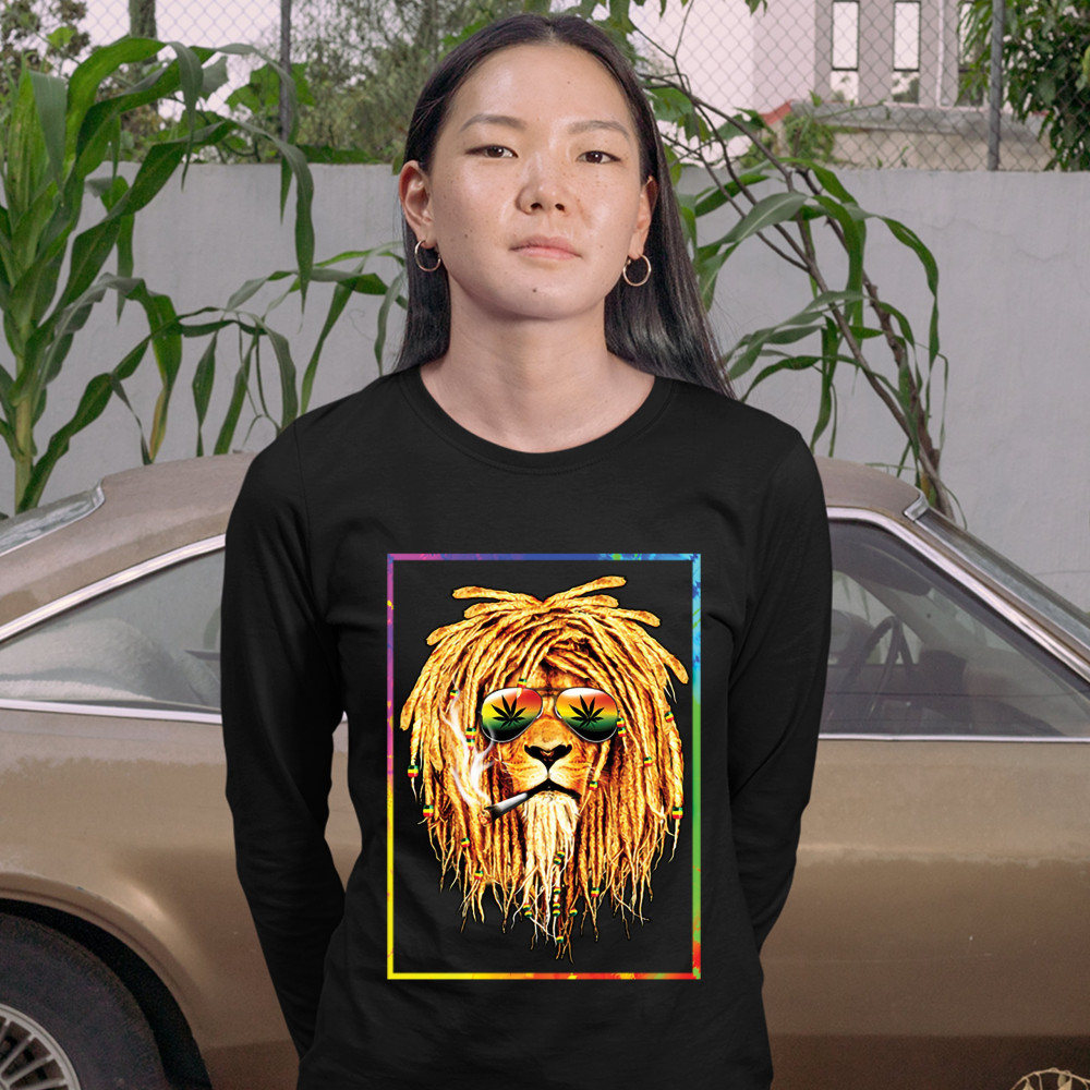 A print featuring a lion with dreadlocks smoking a joint and wearing sunglasses with marijuana leaves reflected in the them. The beads on the lion's dreadlocks and the glasses are painted with traditional Jamaican colors. Great choice for a pot aficionado