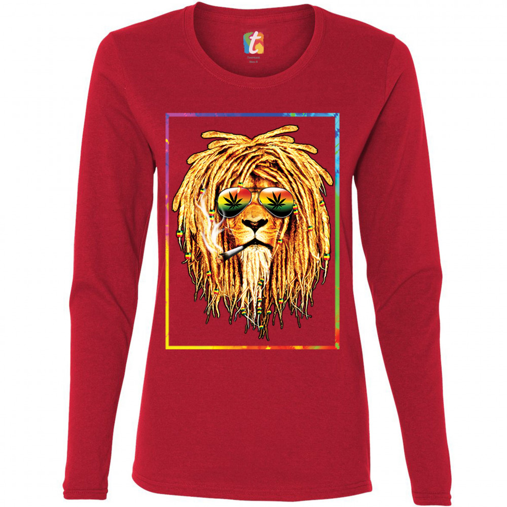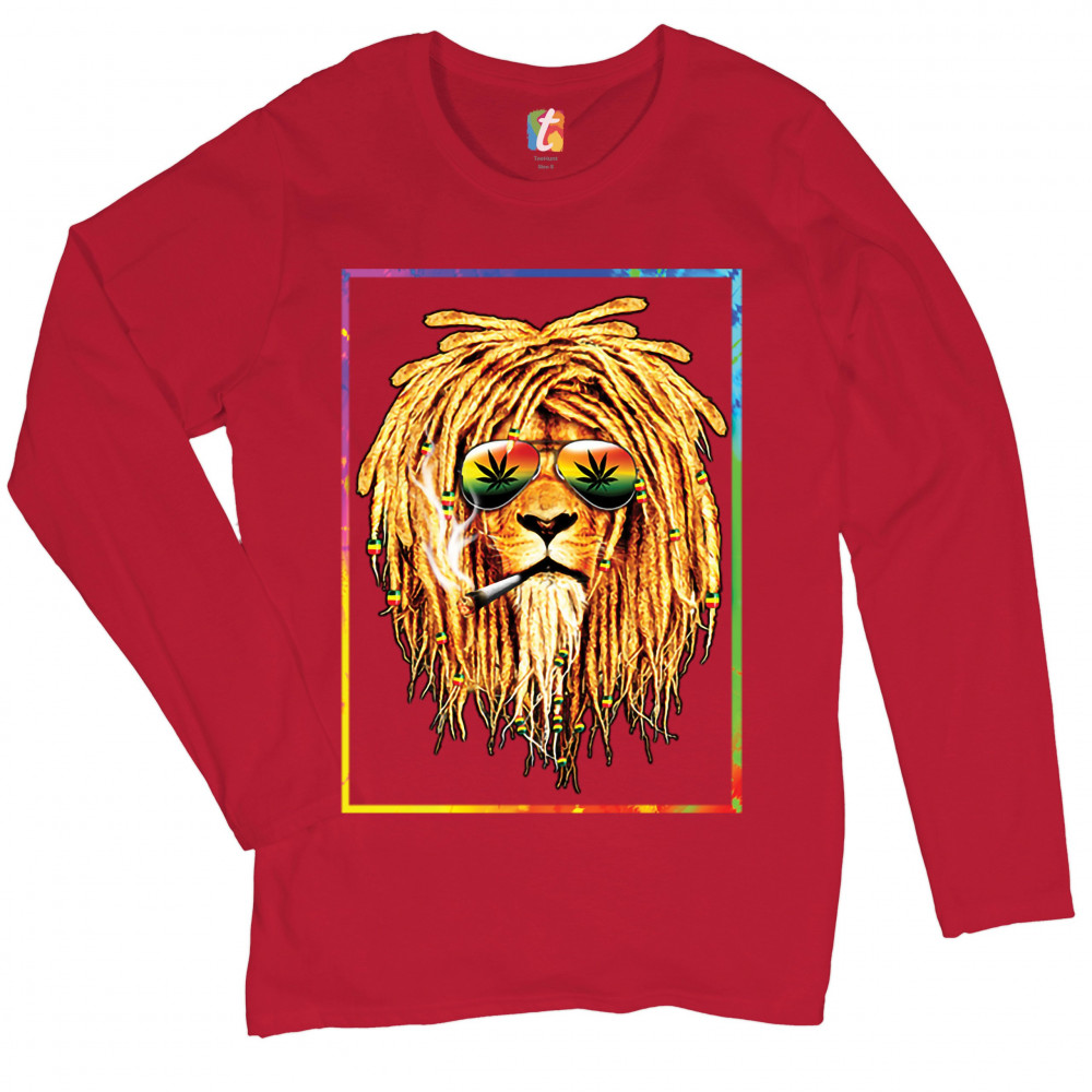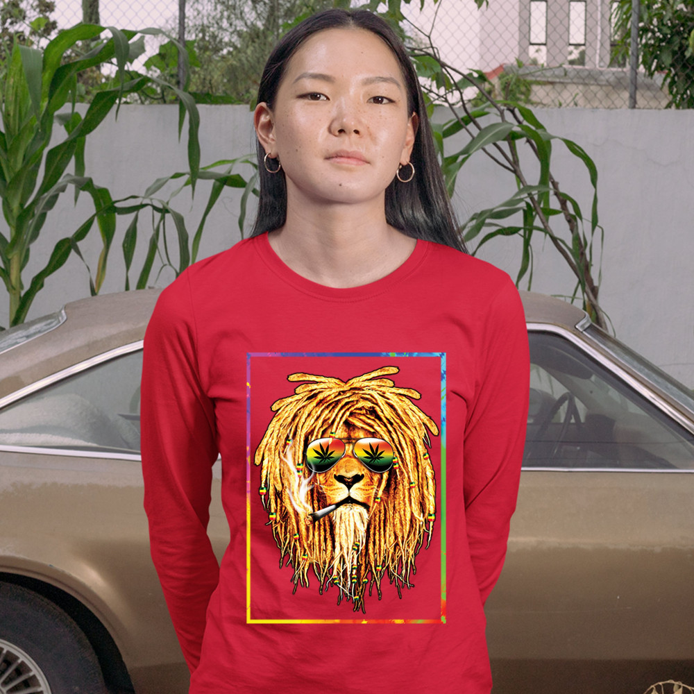 A print featuring a lion with dreadlocks smoking a joint and wearing sunglasses with marijuana leaves reflected in the them. The beads on the lion's dreadlocks and the glasses are painted with traditional Jamaican colors. Great choice for a pot aficionado