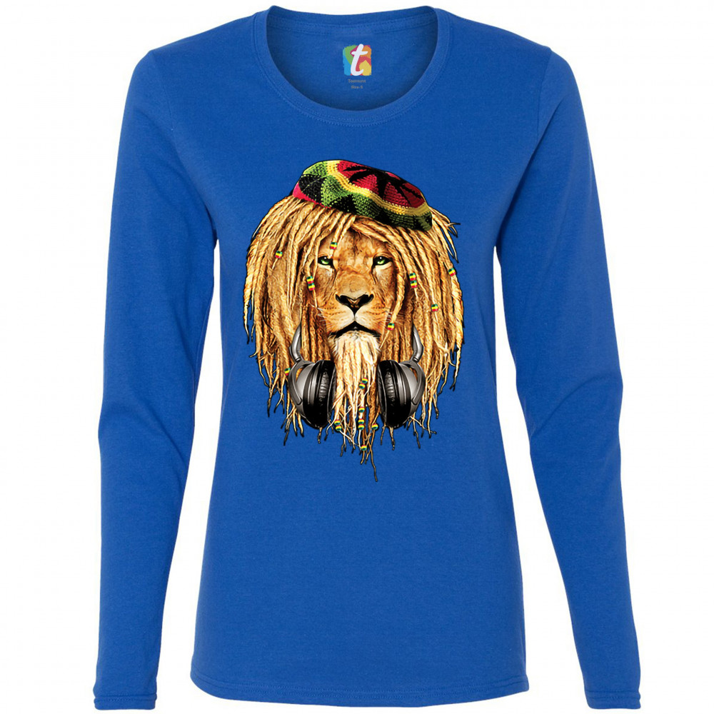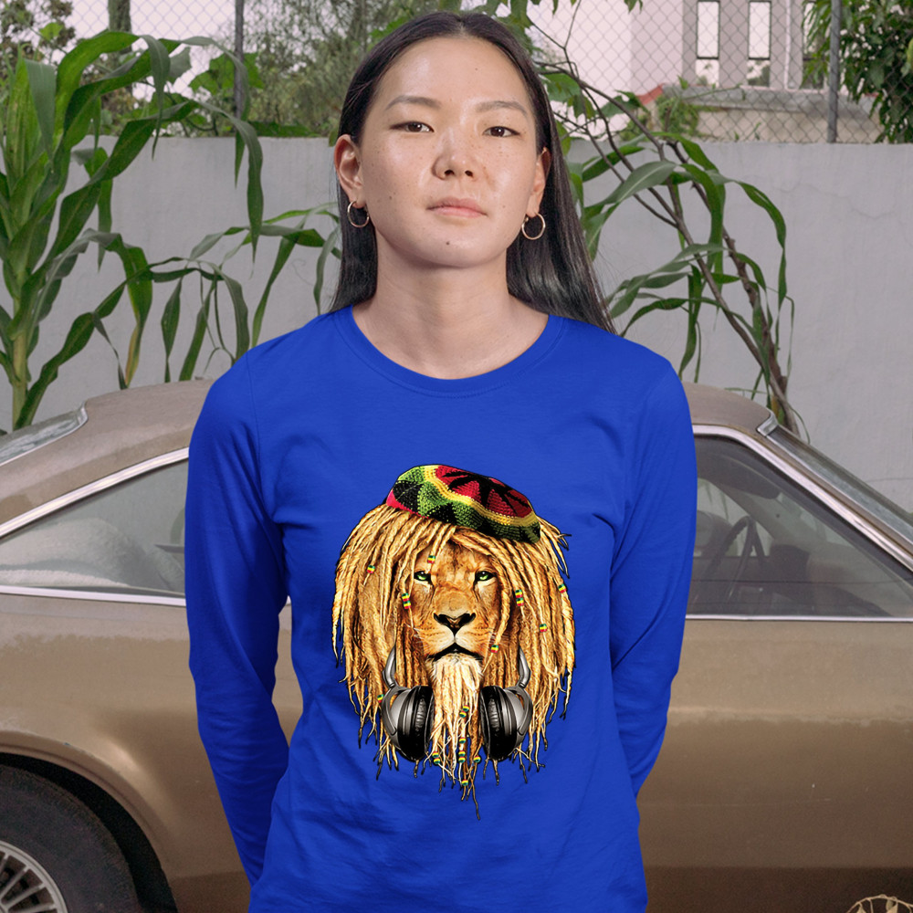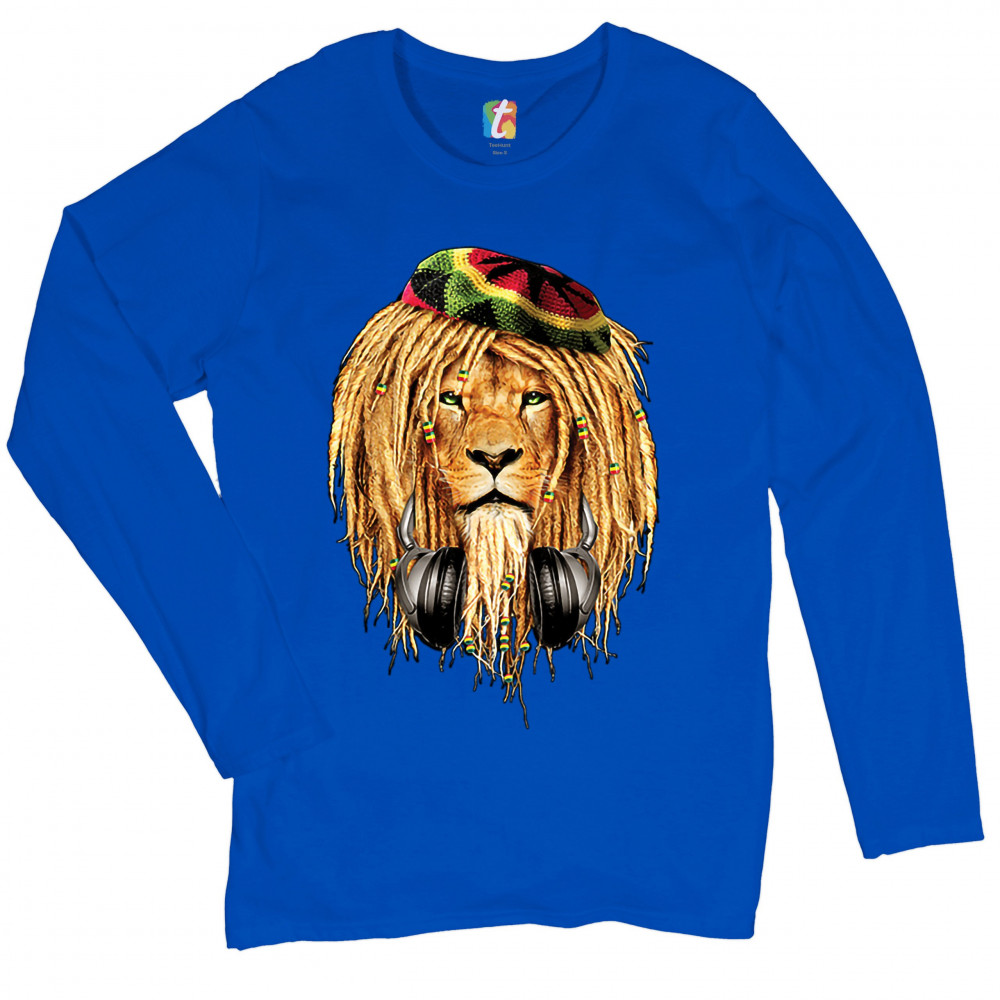 RASTA LION WITH HEADPHONES women's long sleeve t-shirt jah jamaica reggae 420 royal blue