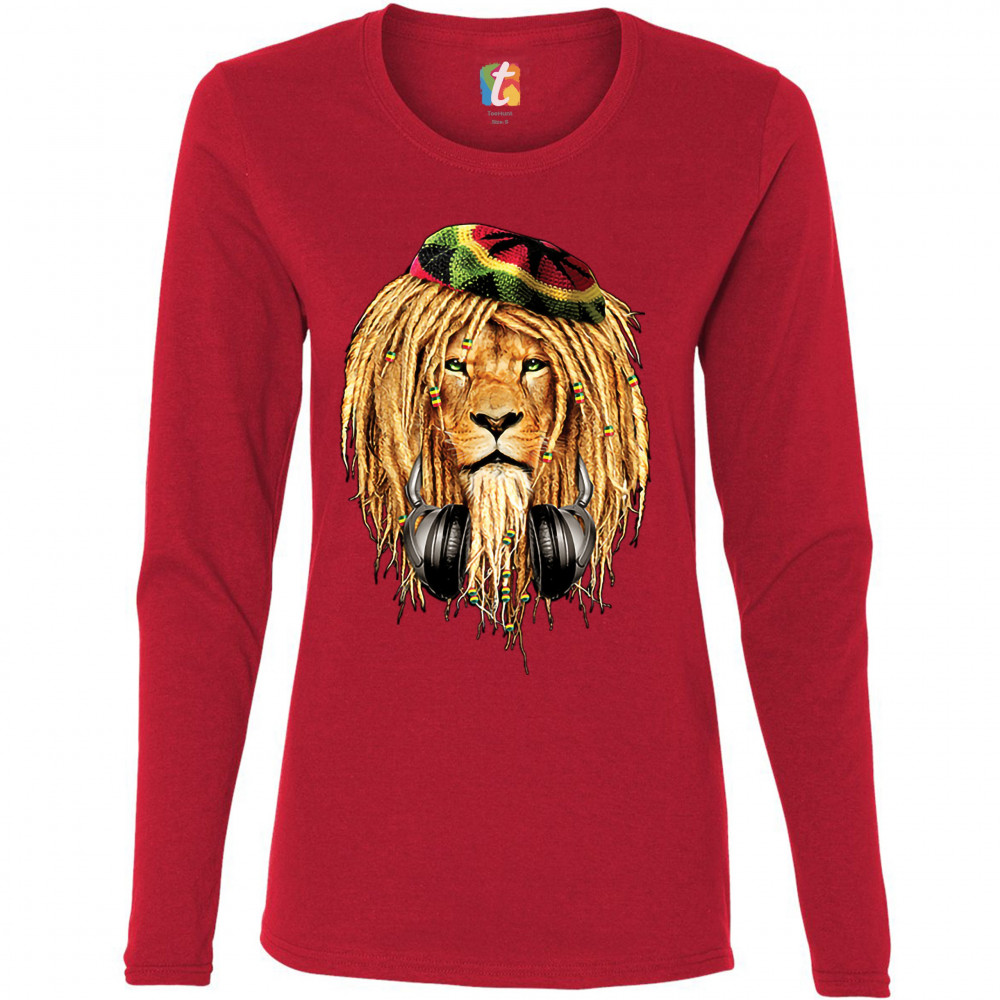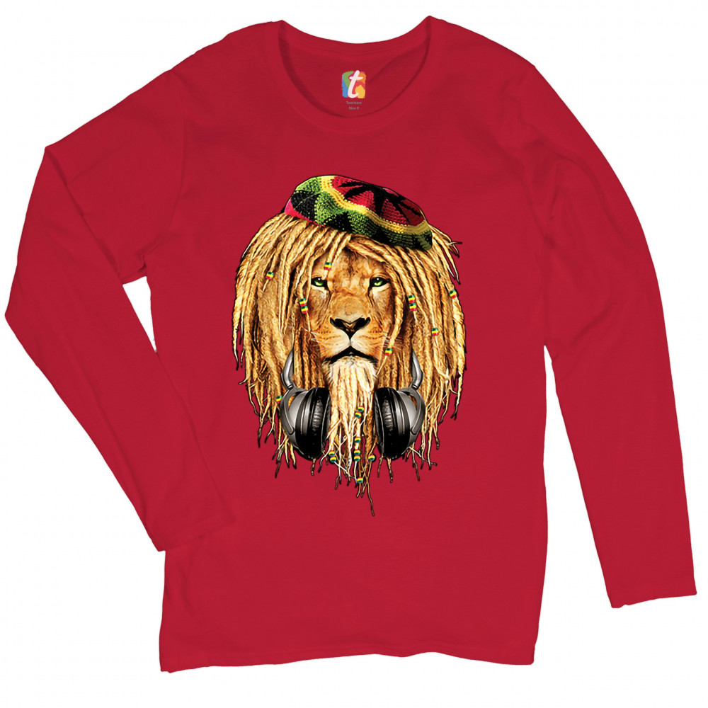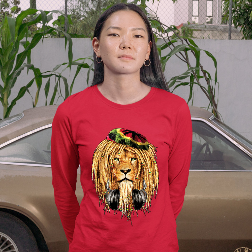 RASTA LION WITH HEADPHONES women's long sleeve t-shirt jah jamaica reggae 420 red