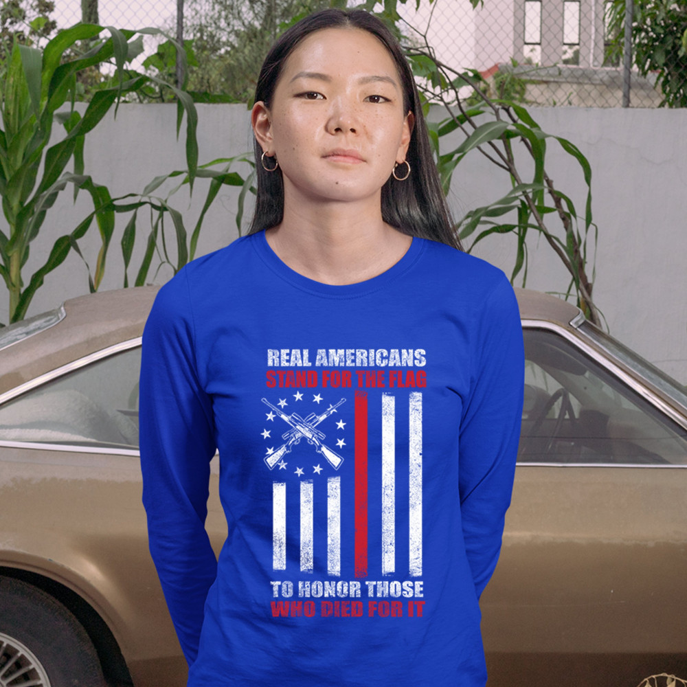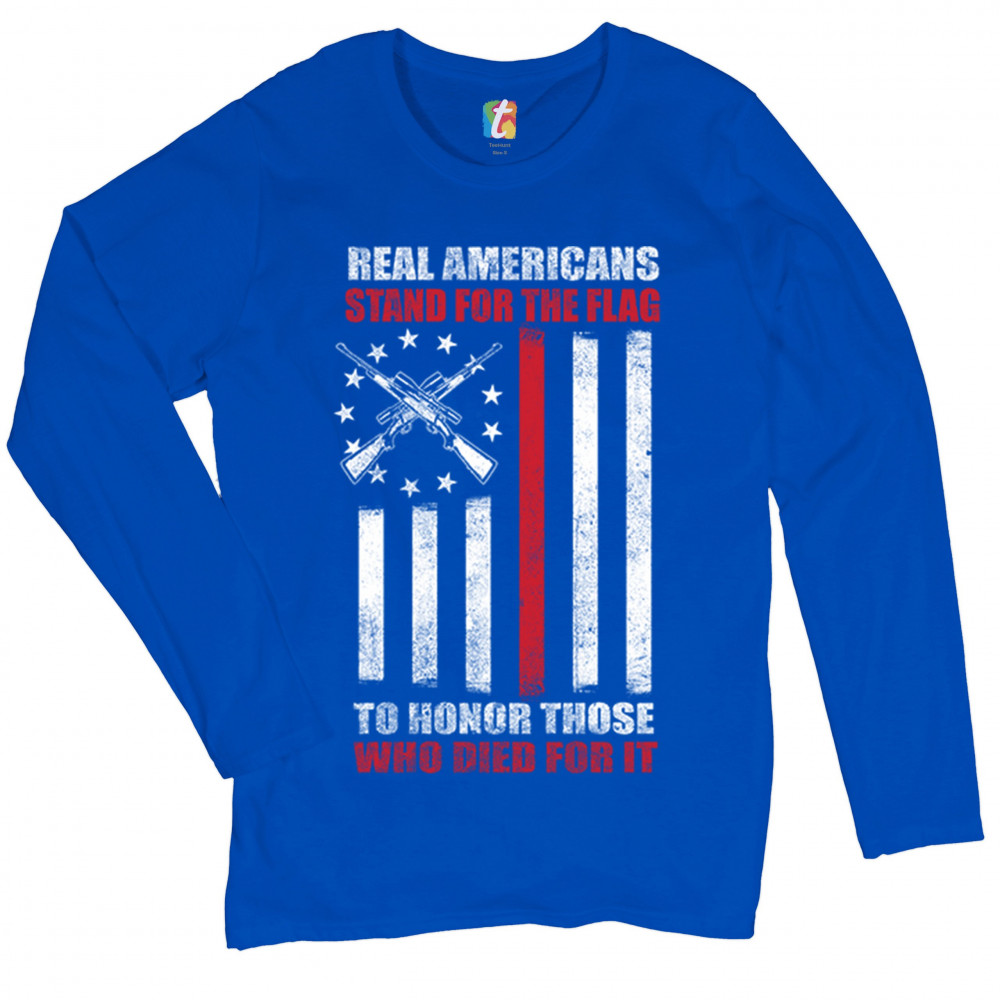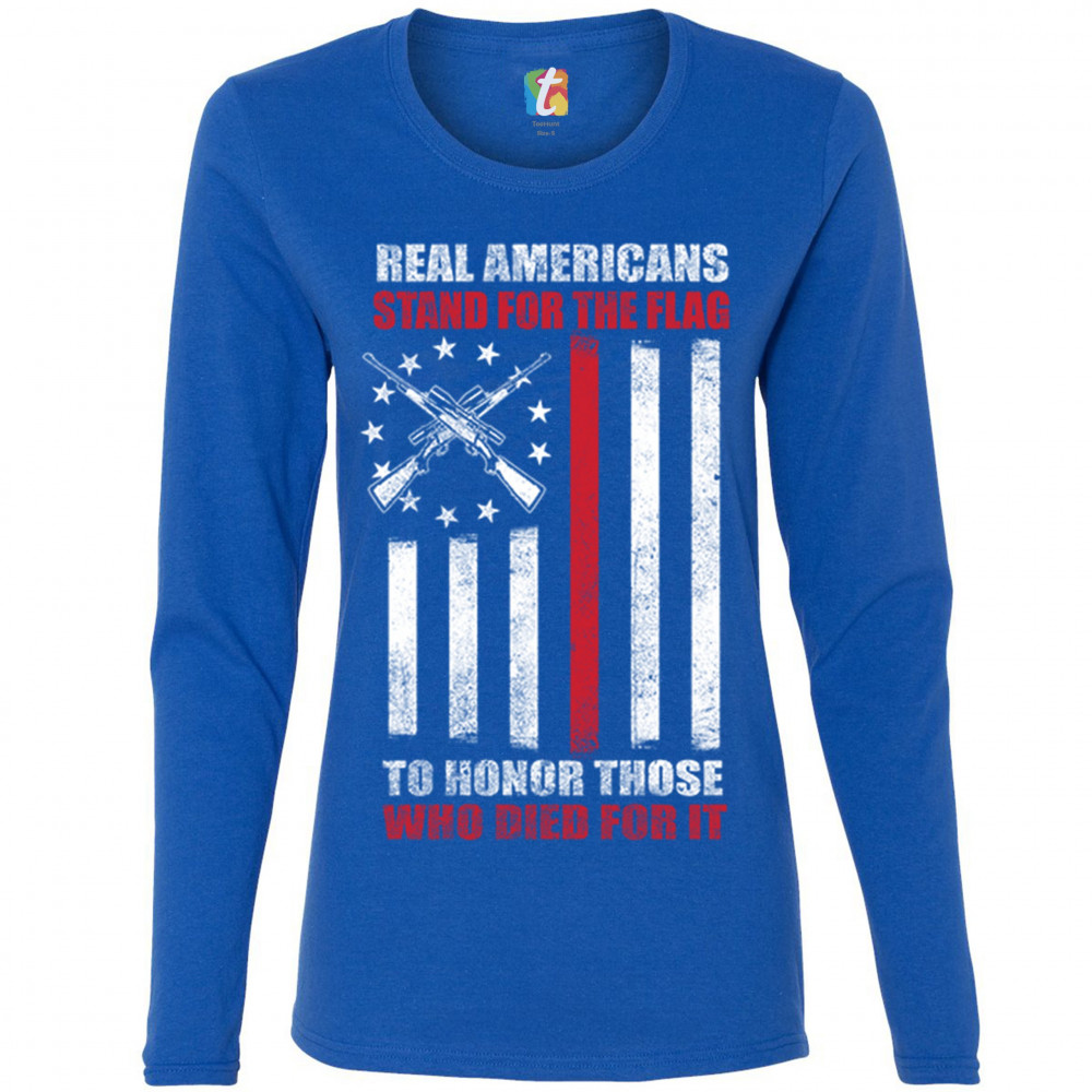 REAL AMERICANS STAND FOR THE FLAG women's long sleeve t-shirt veteran's day royal blue