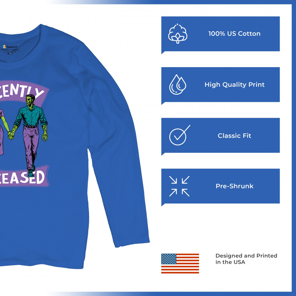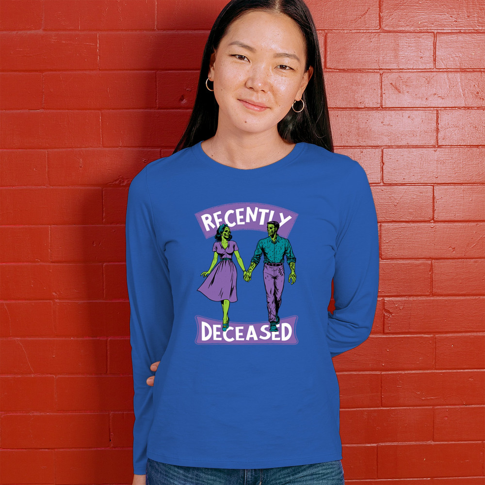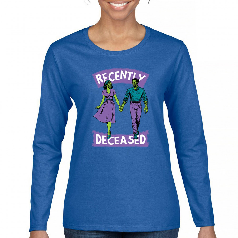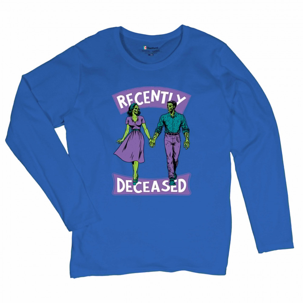 Recently Deceased zombie couple shirt with undead lovers design, spooky season humor, Halloween zombie outfit, and haunted house vibes.