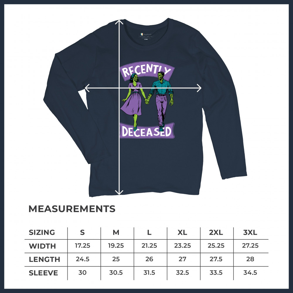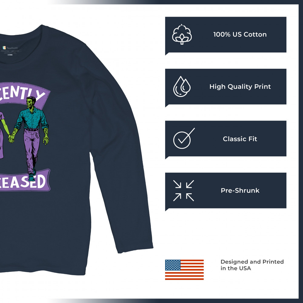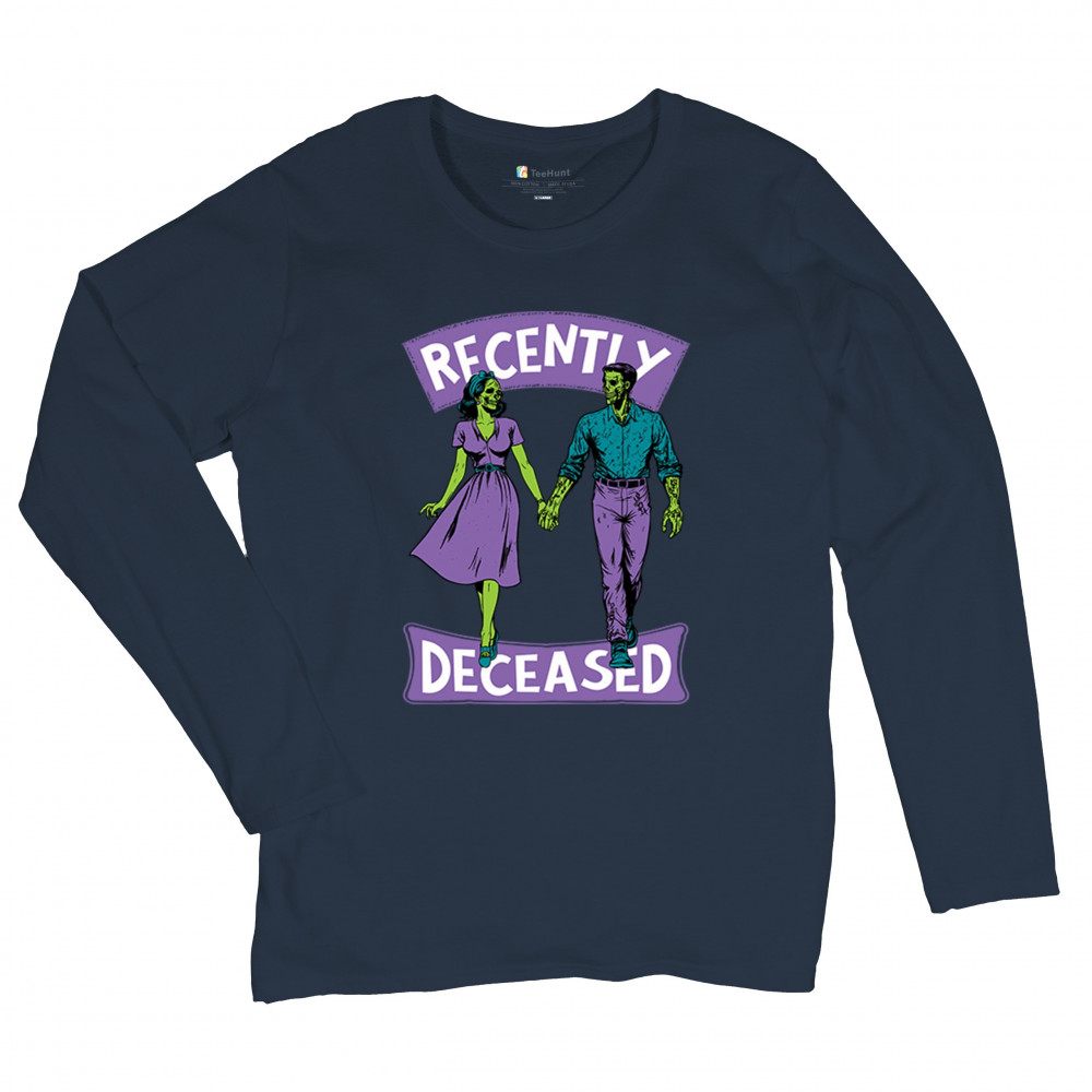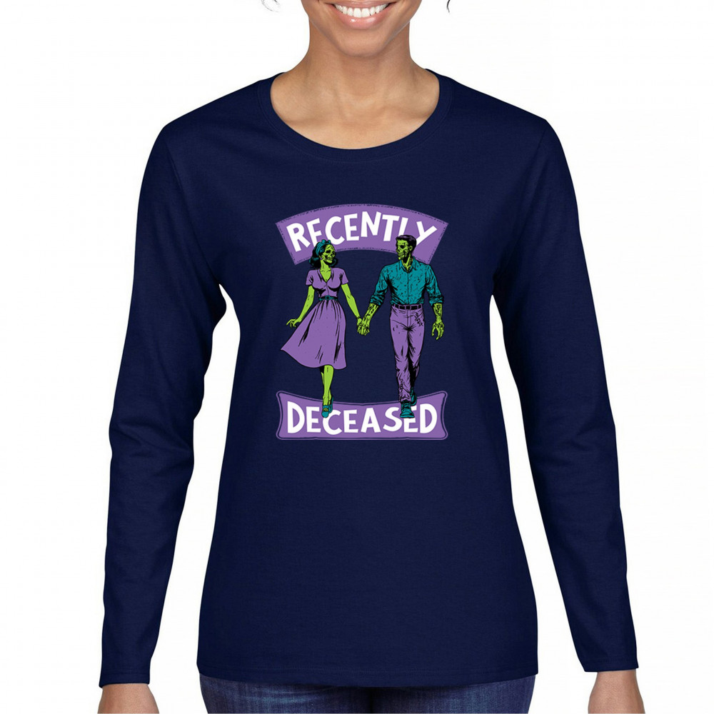 Recently Deceased zombie couple shirt with undead lovers design, spooky season humor, Halloween zombie outfit, and haunted house vibes.