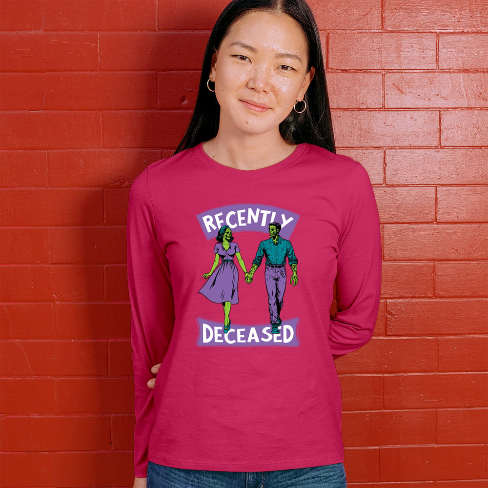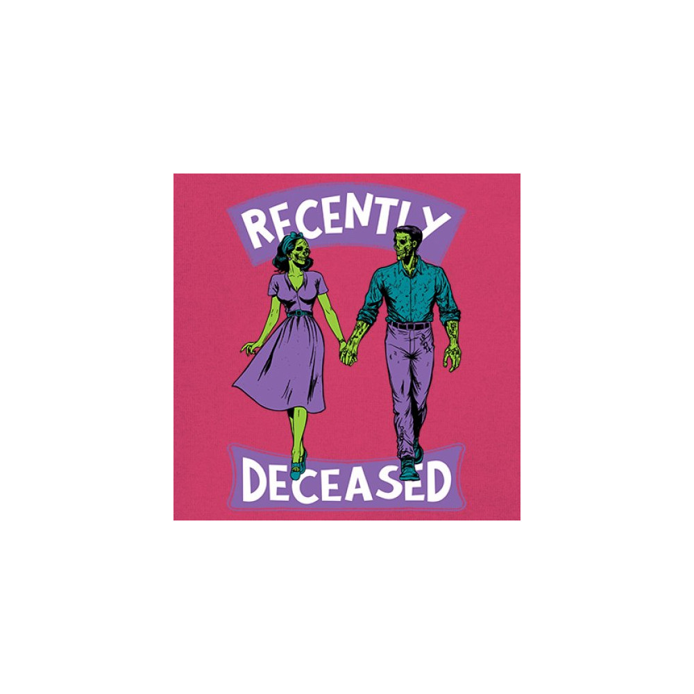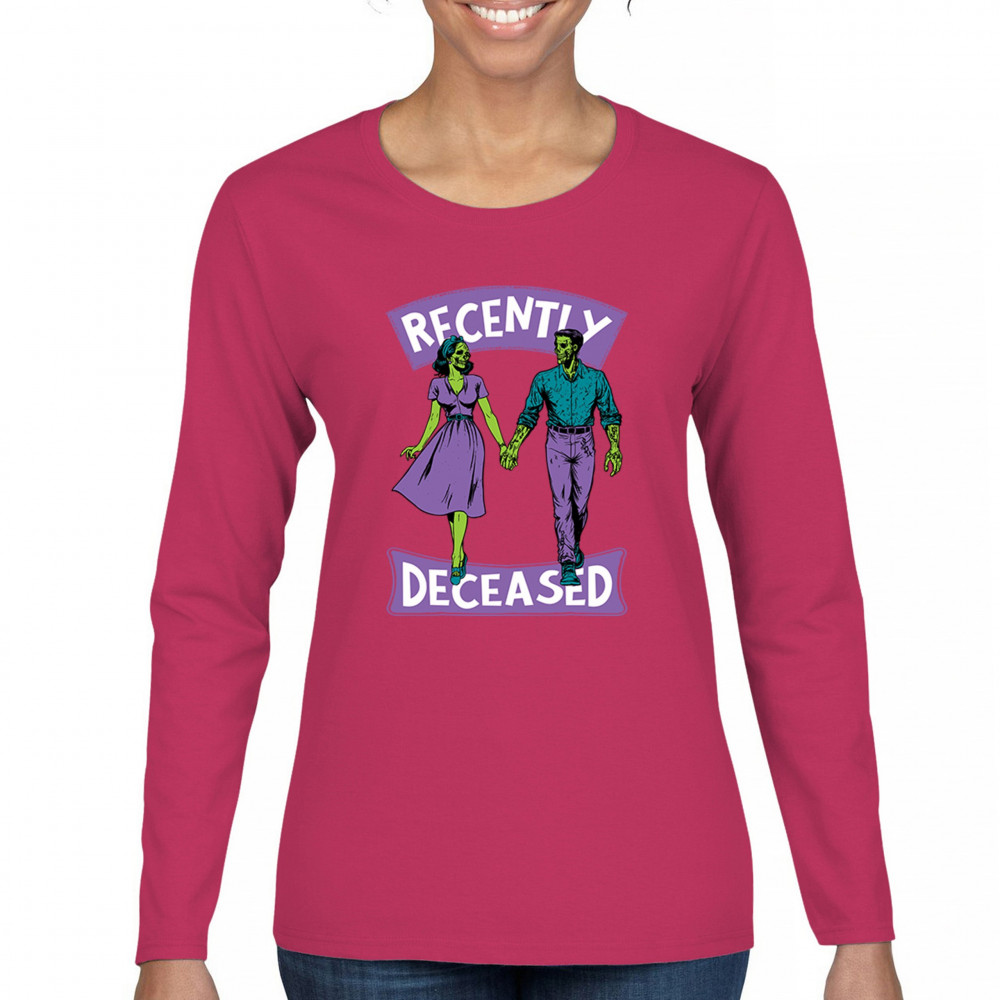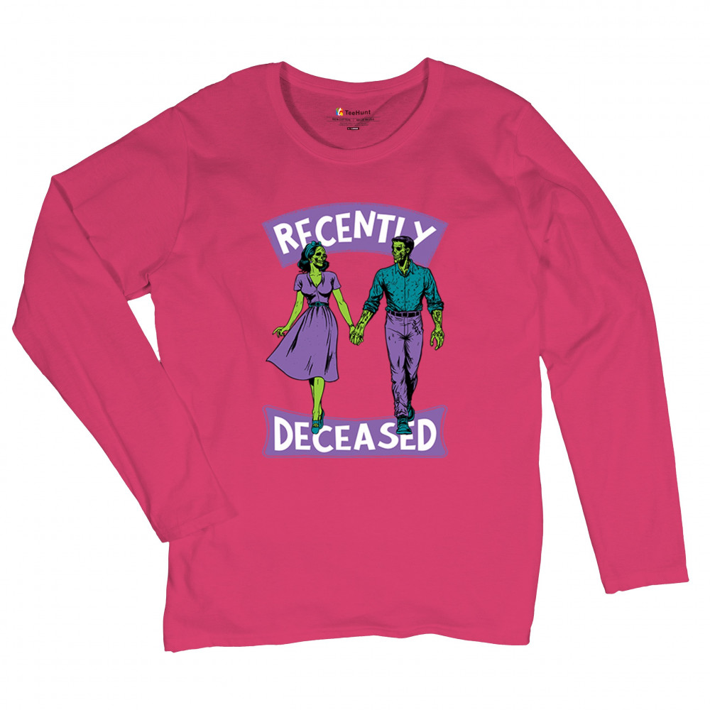 Recently Deceased zombie couple shirt with undead lovers design, spooky season humor, Halloween zombie outfit, and haunted house vibes.