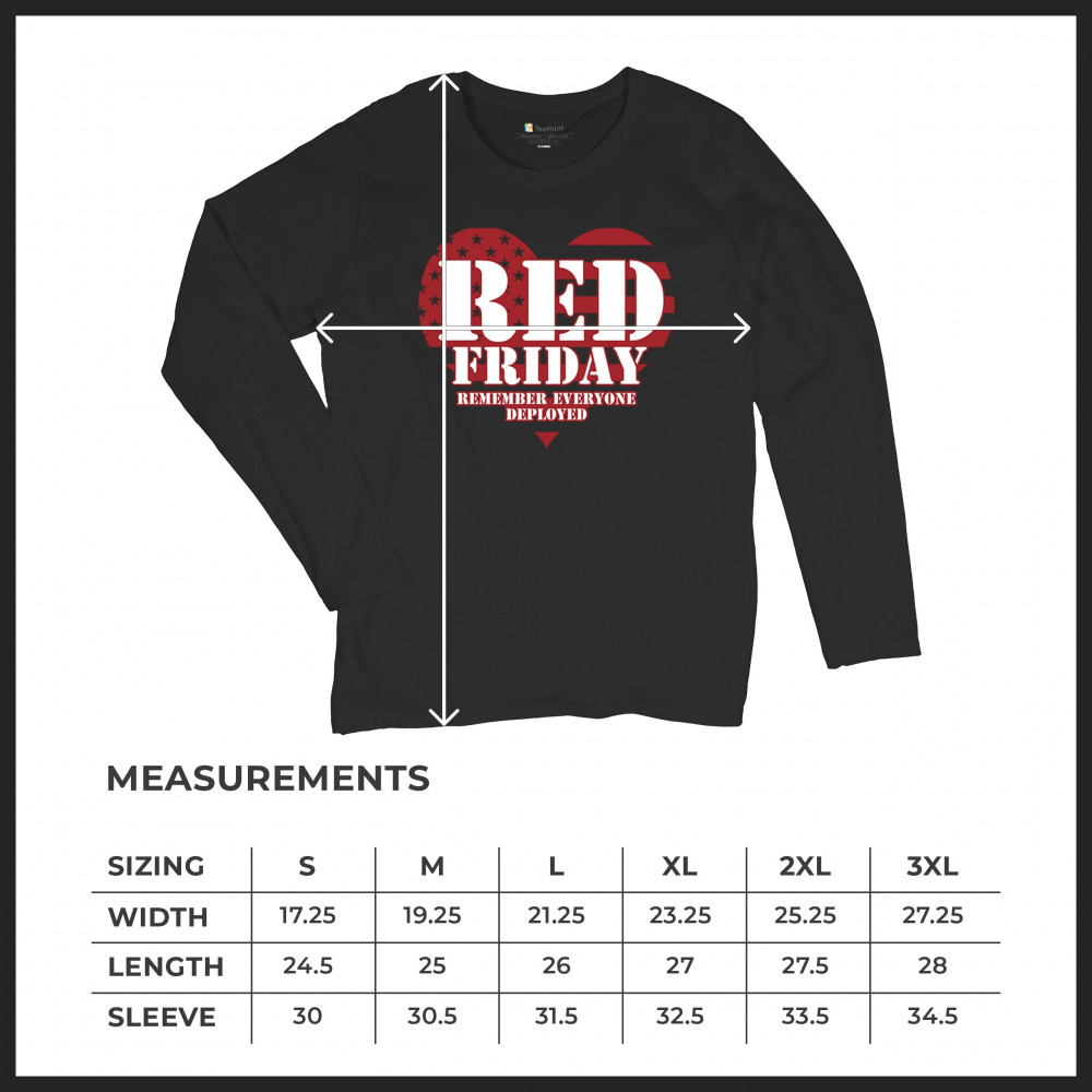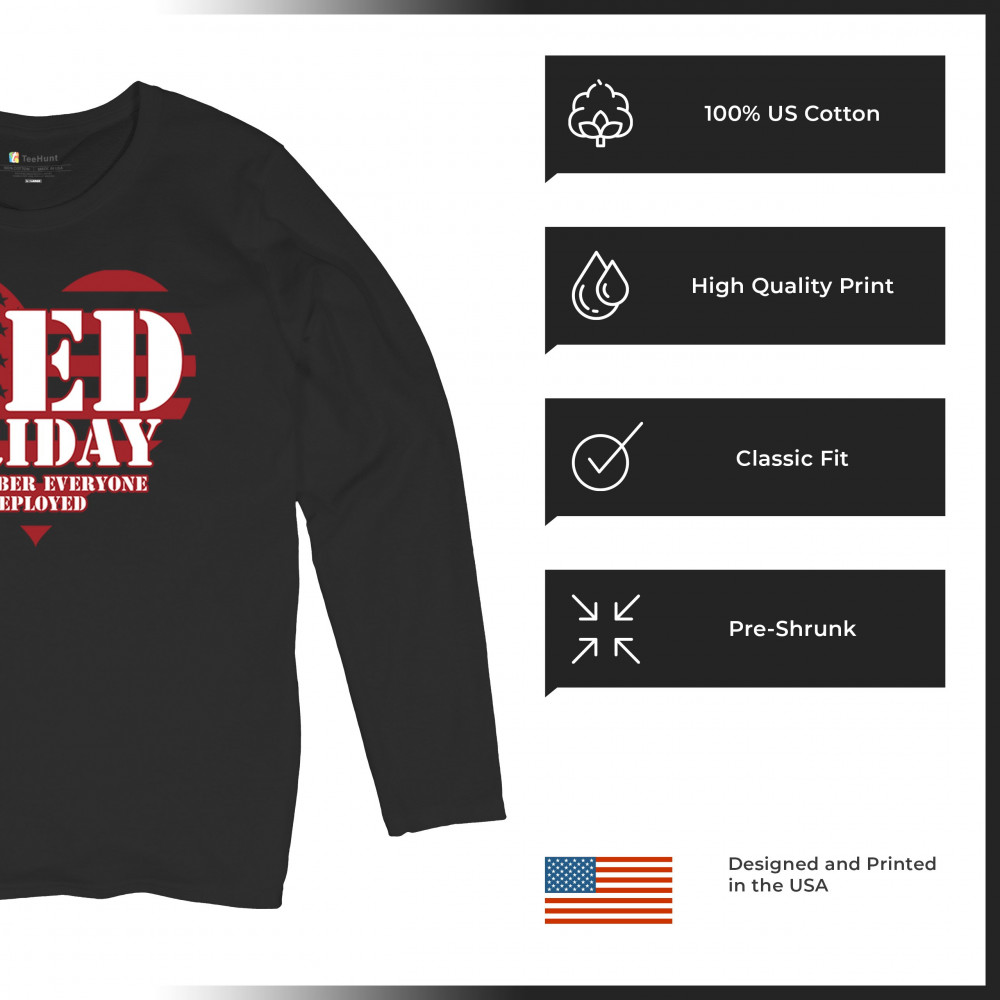 Express your support for our deployed troops with this heartfelt R.E.D. Friday shirt. The design features a bold heart with the message "Remember Everyone Deployed," making it a meaningful addition to any patriotic wardrobe. Made from high-quality, soft fabric, this shirt offers exceptional comfort and durability. Wear it on Veterans Day, Memorial Day, Fourth of July, or any day to honor our military heroes. This shirt also makes a great gift for friends and family who are passionate about supporting our troops.