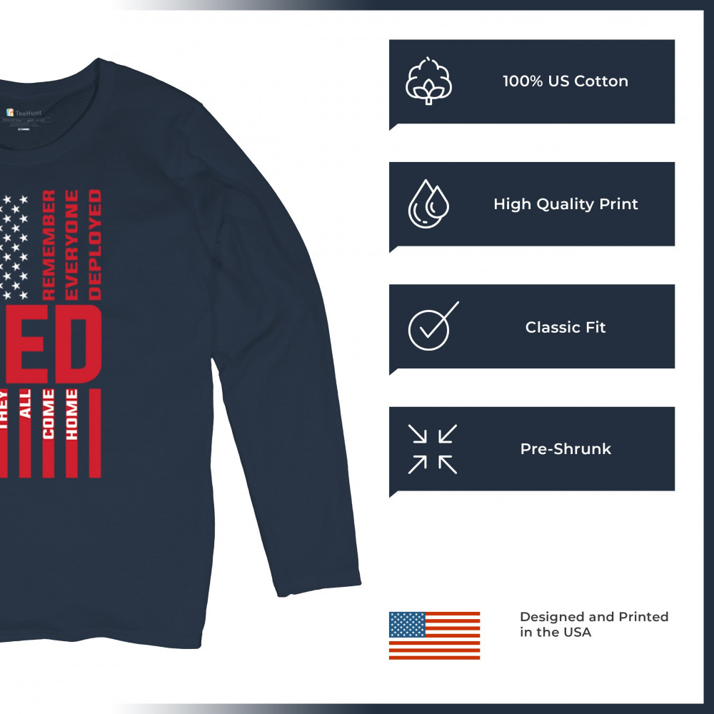 Support our troops with the "RED - Remember Everyone Deployed" design. A powerful reminder to honor our soldiers until they all come home. Ideal for patriotic events and daily wear.