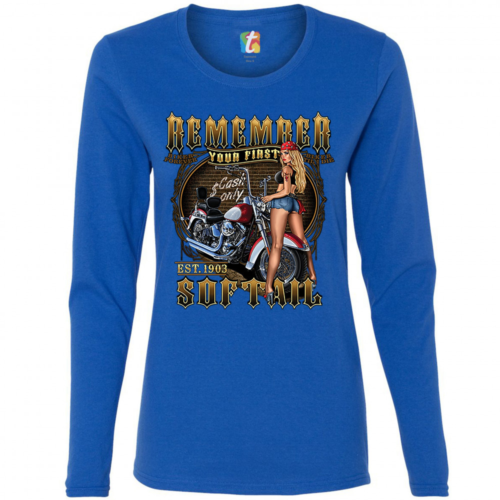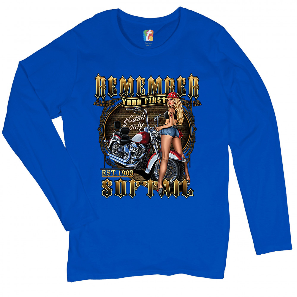 REMEMBER YOUR FIRST SOFTAIL women's long sleeve t-shirt mc biker pin-up girl royal blue